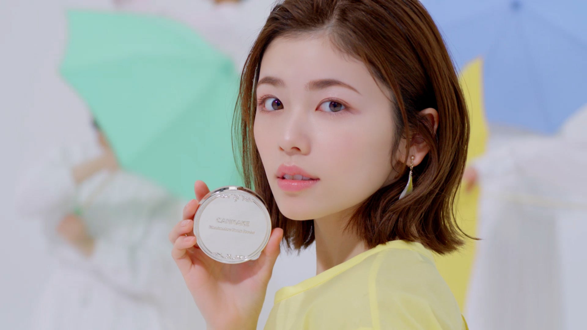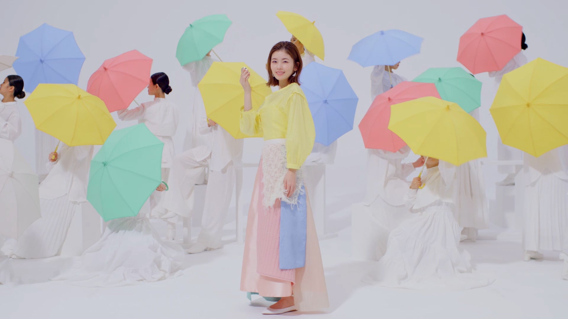 1.「マシュマロフィニッシュパウダー ~Abloom~」を手に持った小芝さんの後ろで、女性たちが次々とカラフルな傘を開いていきます。