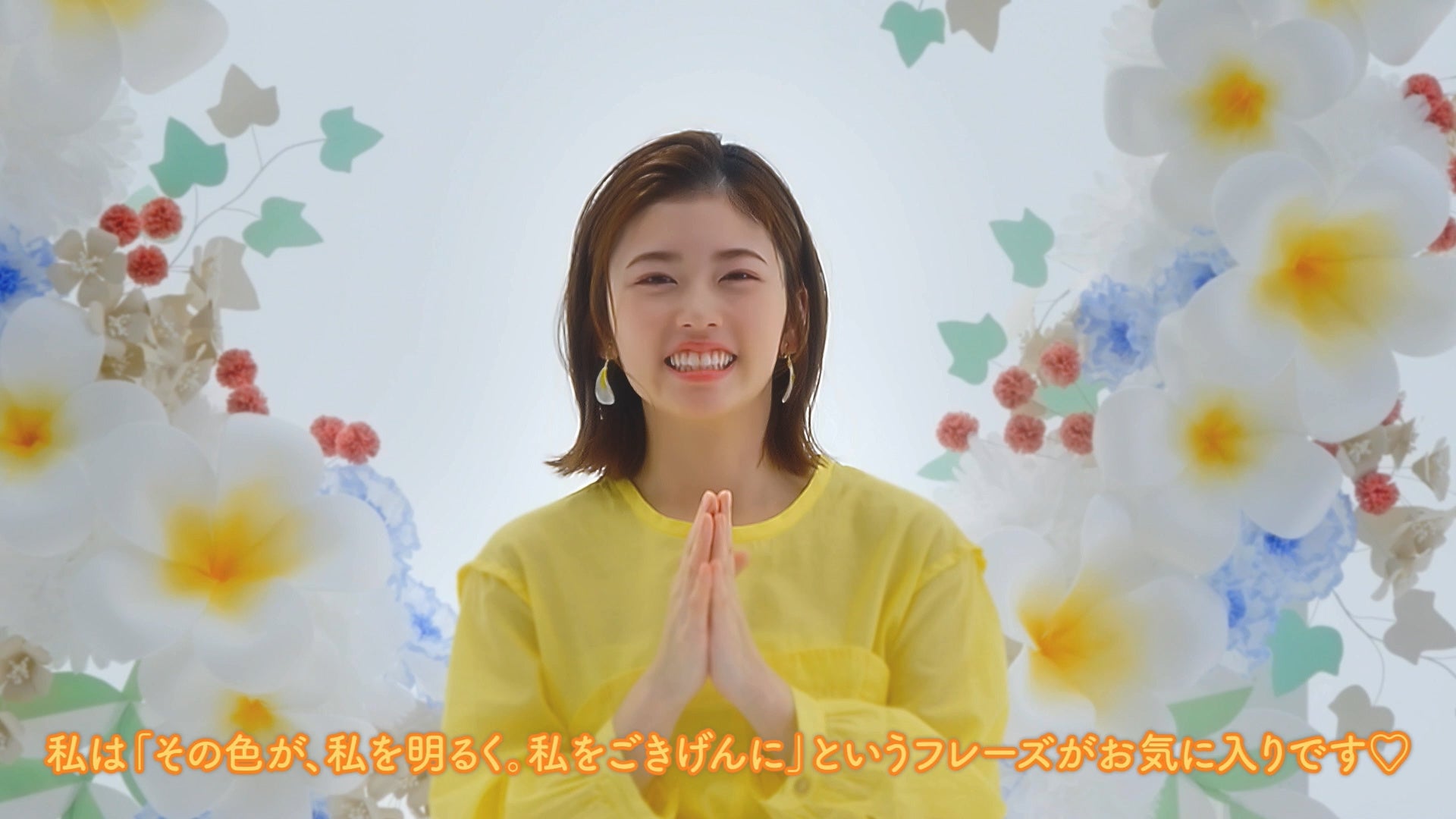 ラストでは、明るく輝く肌の小芝さんが、プルメリアリースカラーの傘から晴れやかな顔を覗かせます。
