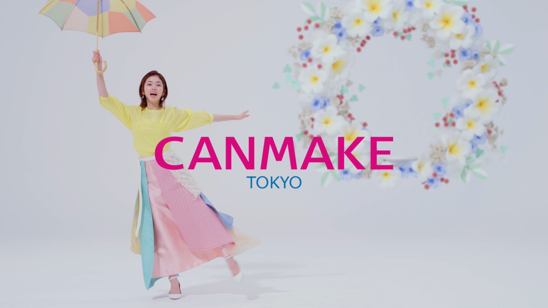 カラフルな傘が集まって、新色の03プルメリアリースになるところです。とってもかわいい新色を傘で表現しているのがめちゃくちゃおしゃれで気に入っています!実は私が着ているこのお洋服も、そのカラーを使っていて、このスカートもスタイリストさんが手作りしてくれました!