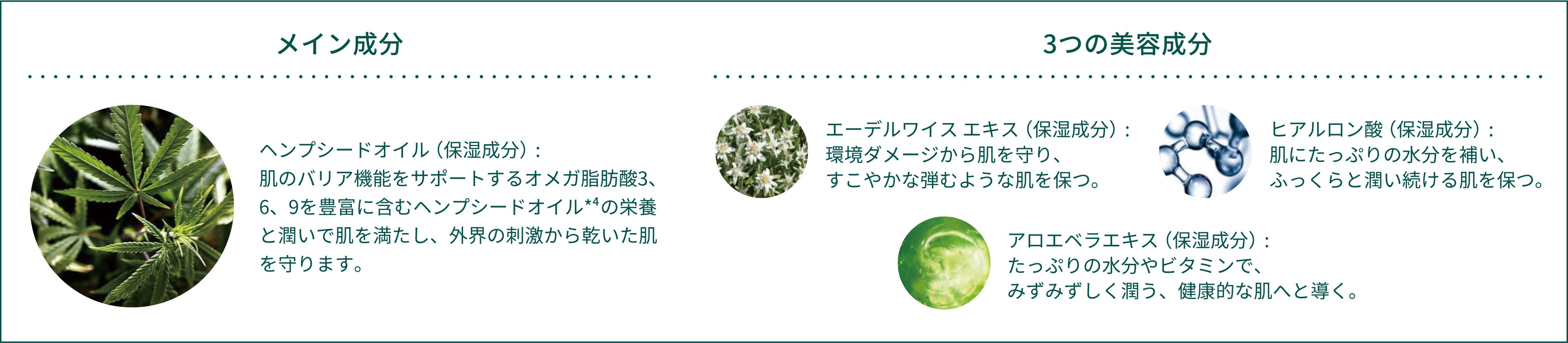 ※1:エーデルワイス花/葉エキス(整肌成分)、アロエベラ葉汁(保湿成分)、ヒアルロン酸Na(保湿成分)のこと ※2:角質層まで ※3:空気中のちり、ほこりのこと ※4:アサ種子油(保湿成分)
