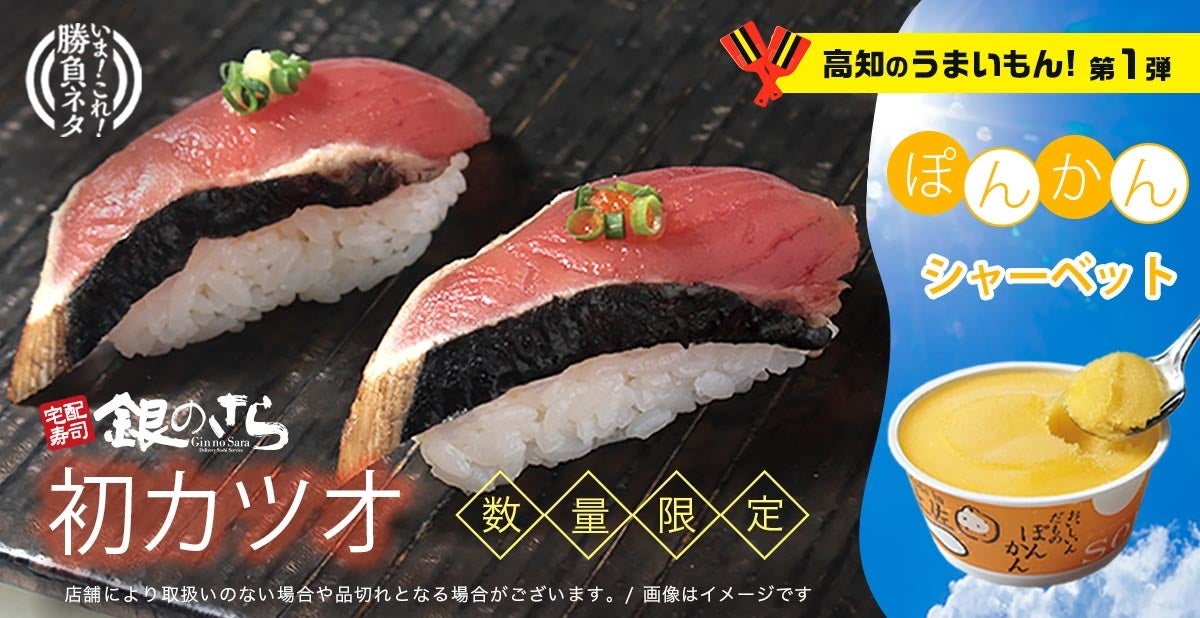 株式会社ライドオンエクスプレスホールディングス(本社:東京都港区、代表取締役社長 江見 朗)は、グループ企業が展開する、宅配寿司「銀のさら」において、【高知のうまいもん!第1弾】として、高知県産『初カツオ』と『ぽんかんシャーベット』を、公式WEBサイト限定で、2022年7月1日(金)~8月31日(水)の期間、数量限定で販売いたします。
