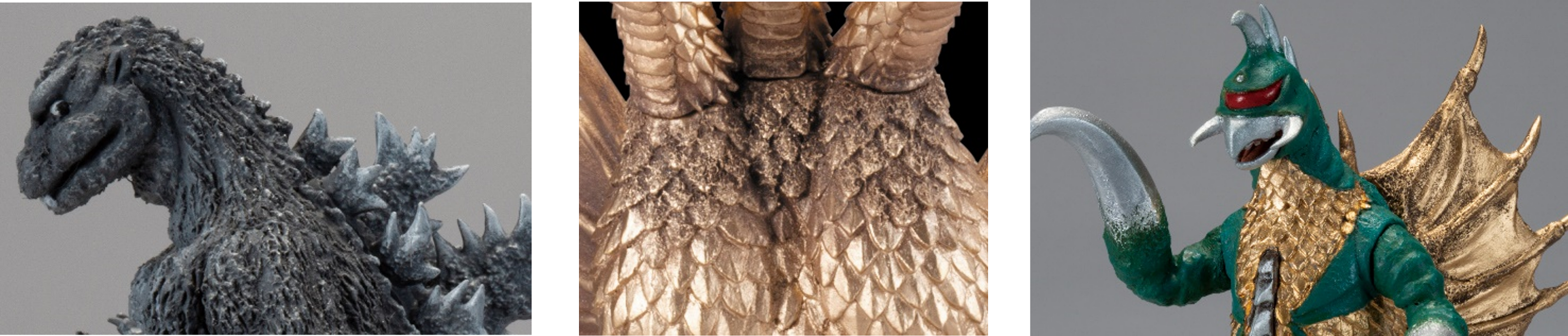 ゴジラや怪獣の皮膚感や複雑なヒレなども、劇中同様に細部まで徹底再現。極彩色が特徴のガイガンをはじめとする人気怪獣も、細部まで丁寧に塗りわけた塗装済みフィギュア・パーツで提供します。