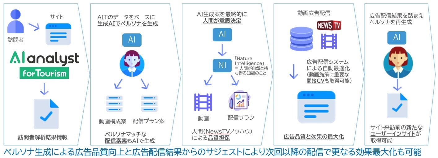 観光関連サイトのデータを基に、AIが潜在顧客の嗜好を抽出。NewsTVの知見を活かし、視聴者に響く動画広告コンテンツを提案・制作。