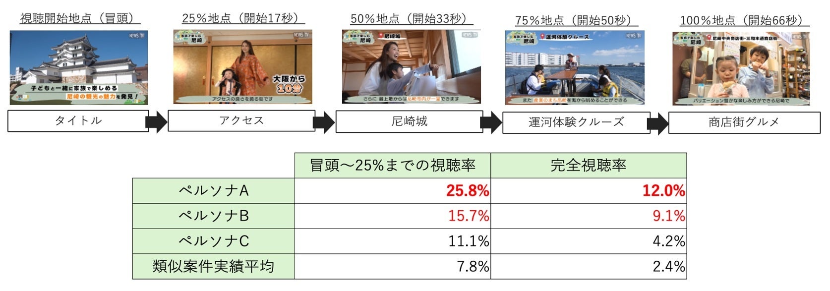 ・ 視聴開始から完全視聴までの視聴率推移では、ペルソナAの冒頭視聴率が25.8%と平均の約3倍高く、AI仮説から興味対象とされていた「尼崎城」が紹介されるシーンでは、ペルソナを問わず視聴率が急上昇。特にペルソナAは最後まで高い視聴率を維持しました。ここでもAIによる仮説が、高い効果を実証いたしました。