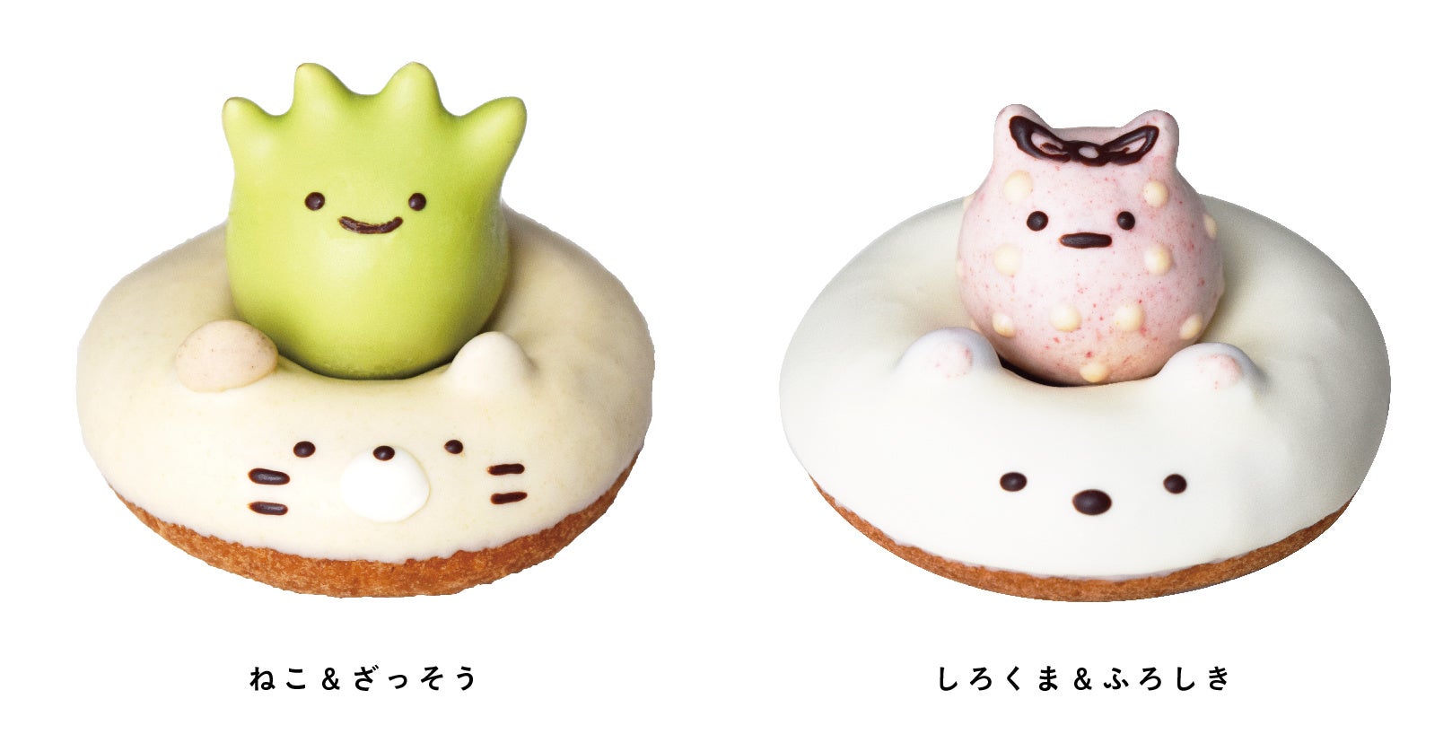 第1弾として、「ねこ&ざっそう」「しろくま&ふろしき」が、それぞれちょこんとパートナーを乗せた愛くるしいドーナツに仕上げました。