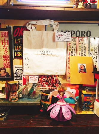 これは、人間が交わる立ち飲み屋さんにトートバックを置かせてもらい、題名の言葉をバックに添え作り上げた作品です。