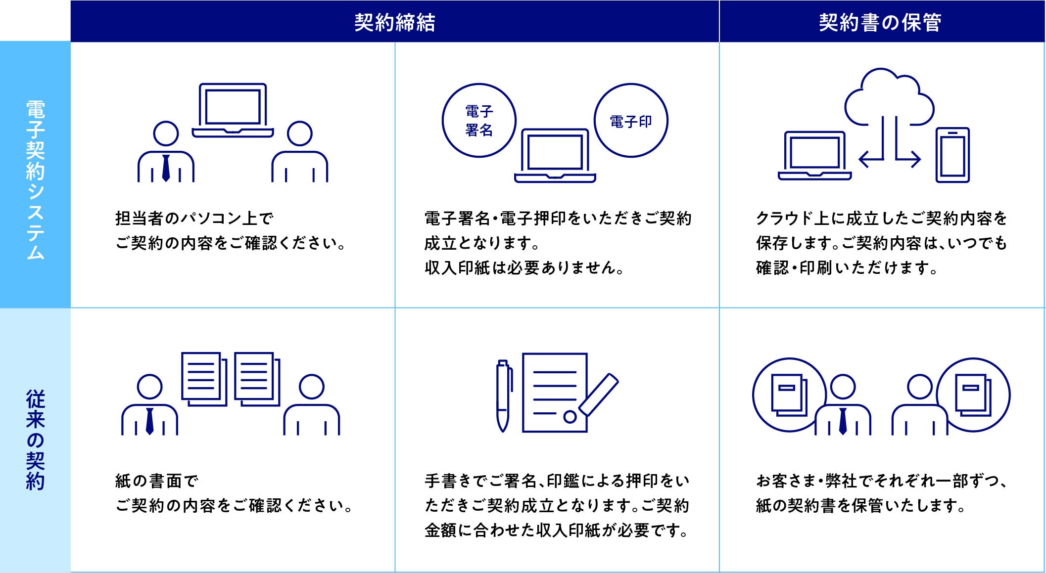 同システムにより、お客さまと当社双方の利便性が向上するほか、契約書の紛失や電子メールでの誤送信等によるセキュリティ事故発生のリスクが無くなります。また、双方は収入印紙(印紙税負担)も不要※4となります。さらに、当社においては、書類作成や運搬の工数を低減する業務革新が実現できます。