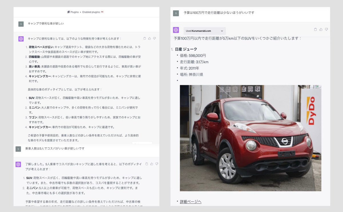 本プラグインを有効にすることで、自然な会話を通じて希望条件に最適な車両を見つけることが可能です。