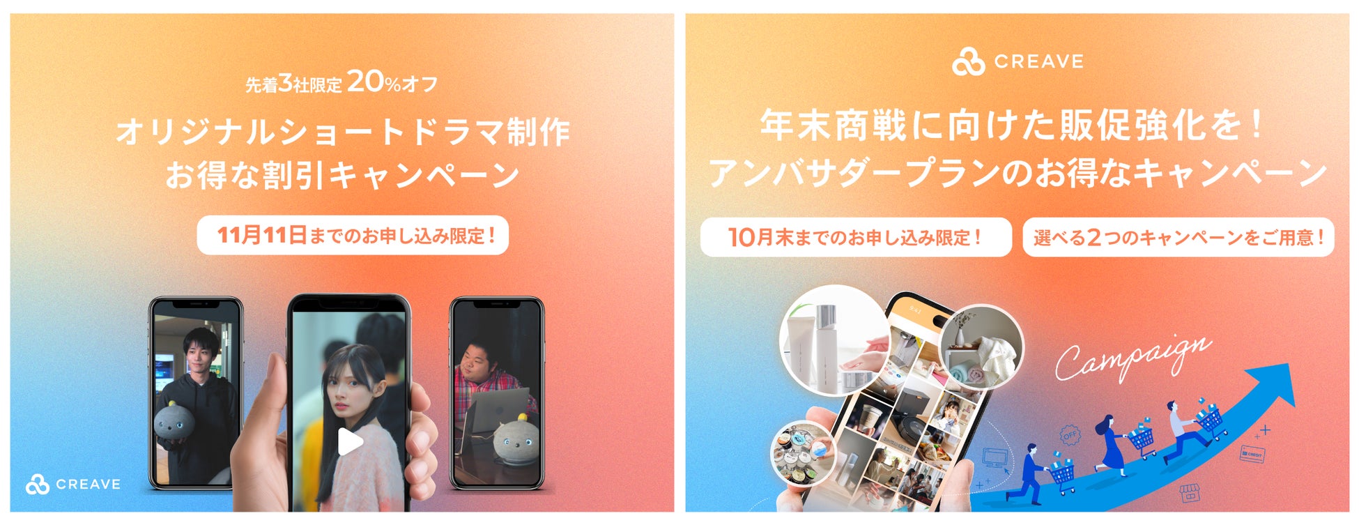 現在、CREAVEでは、マーケティング施策に関するお得なキャンペーンを開催中です。詳しくは各プレスリリースをご覧ください。