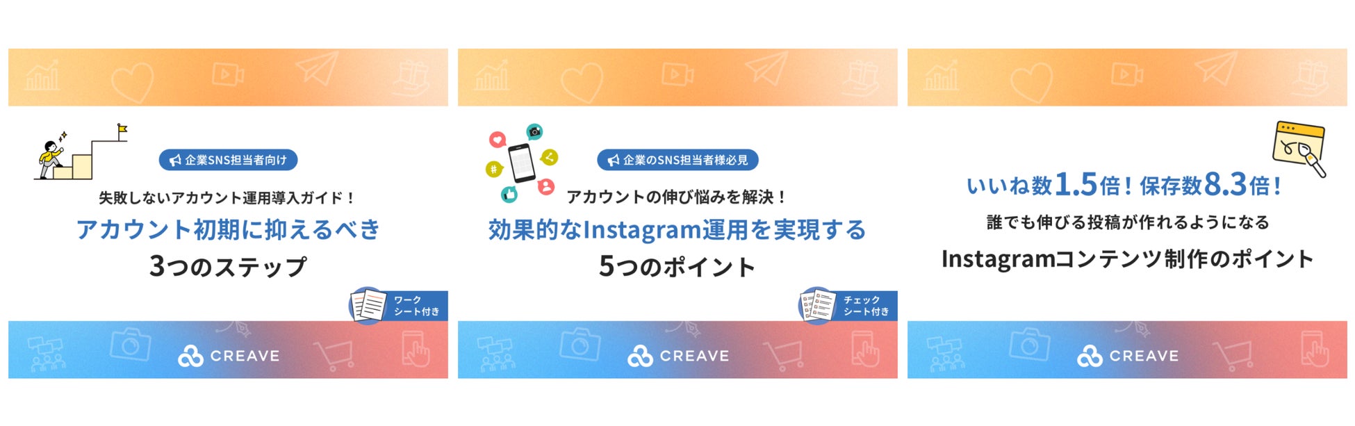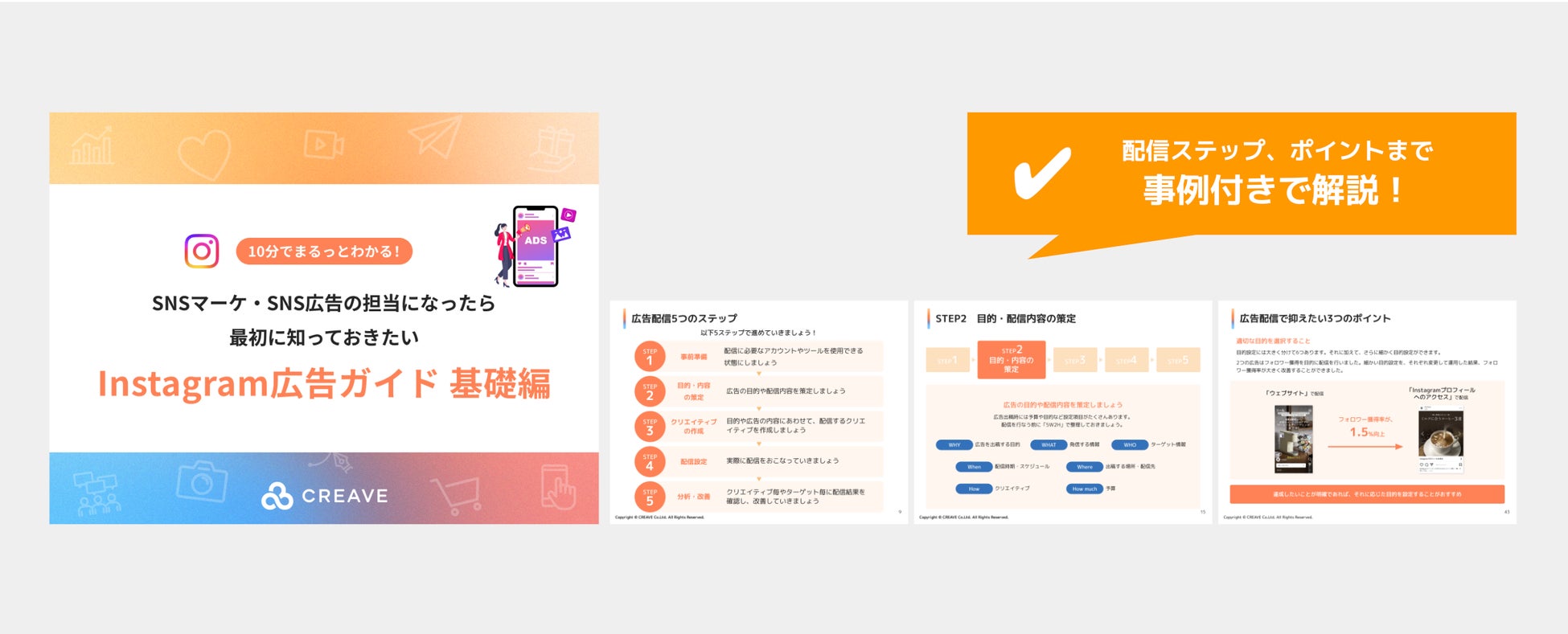 クリエイターとの共創を通じて企業のマーケティング課題を解決する、株式会社CREAVE(本社:東京都千代田区、代表取締役社長:中村真奈、以下 CREAVE)は、企業のSNSマーケティング・SNS広告担当者様向けにお役立ち資料『10分でまるっとわかる!SNSマーケ・SNS広告の担当になったら最初に知っておきたいInstagram広告ガイド 基礎編』を10月24日(木)に無料公開しました。