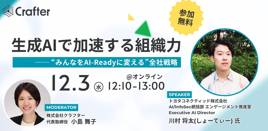 AI/InfoSec統括部 エンゲージメント推進室 Executive AI Director 川村将太(しょーてぃー)氏 を招き、法人における生成AI活用をテーマにした無料オンラインセミナー「A生成AIで加速する組織〜みんなをAI-Readyに変える全社戦略〜」を2025年12月3日(水)に開催いたします。モデレーターは、株式会社クラフター代表取締役の小島舞子が務めます。