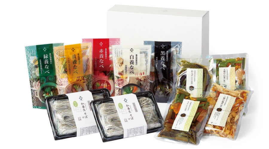 中国古来の自然哲学「五行思想」に着想を得て作られた養生なべの素。白湯スープの「白養なべ」、ダイダイが香る爽やかで旨みの濃いトマト味の「赤養なべ」など5種類の味わいをご堪能いただけます。食卓を彩る温かな笑顔と、真っ白な湯気を上げる養生なべ。贈る相手の幸せな情景が、自然と浮かぶギフトです。