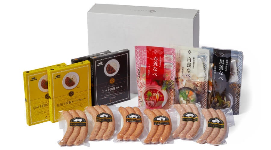 南アルプスの麓で徹底した衛生管理の下、手間暇かけてすこやかに育てられた「信州十四豚(シンシュウジューシーポーク)」は、飼料と環境にこだわっているので、やわらかさ、瑞々しさ、旨み、すべてが格別。こだわりの信州十四豚をソーセージやカレーで、いつでも気軽に味わえるギフトセットは、贈られた方のご褒美タイムを、さらに特別なものにします。