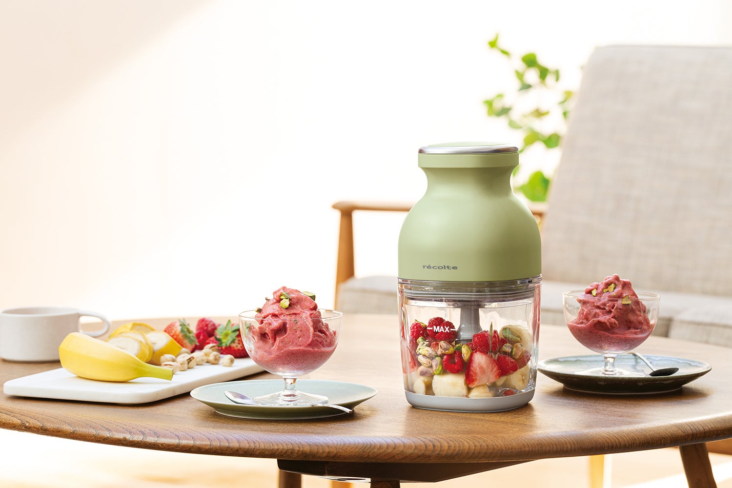 1台で「刻む・混ぜる・砕く・練る・つぶす・鬼おろし・おろし・泡立てる」の8役をこなし、市販の氷も砕けるパワフルさ。今の季節には冷凍フルーツでジェラート作りもおすすめ。ガラス製カップは、においや色移りが少なく、食材の様子も見やすいのが特長。