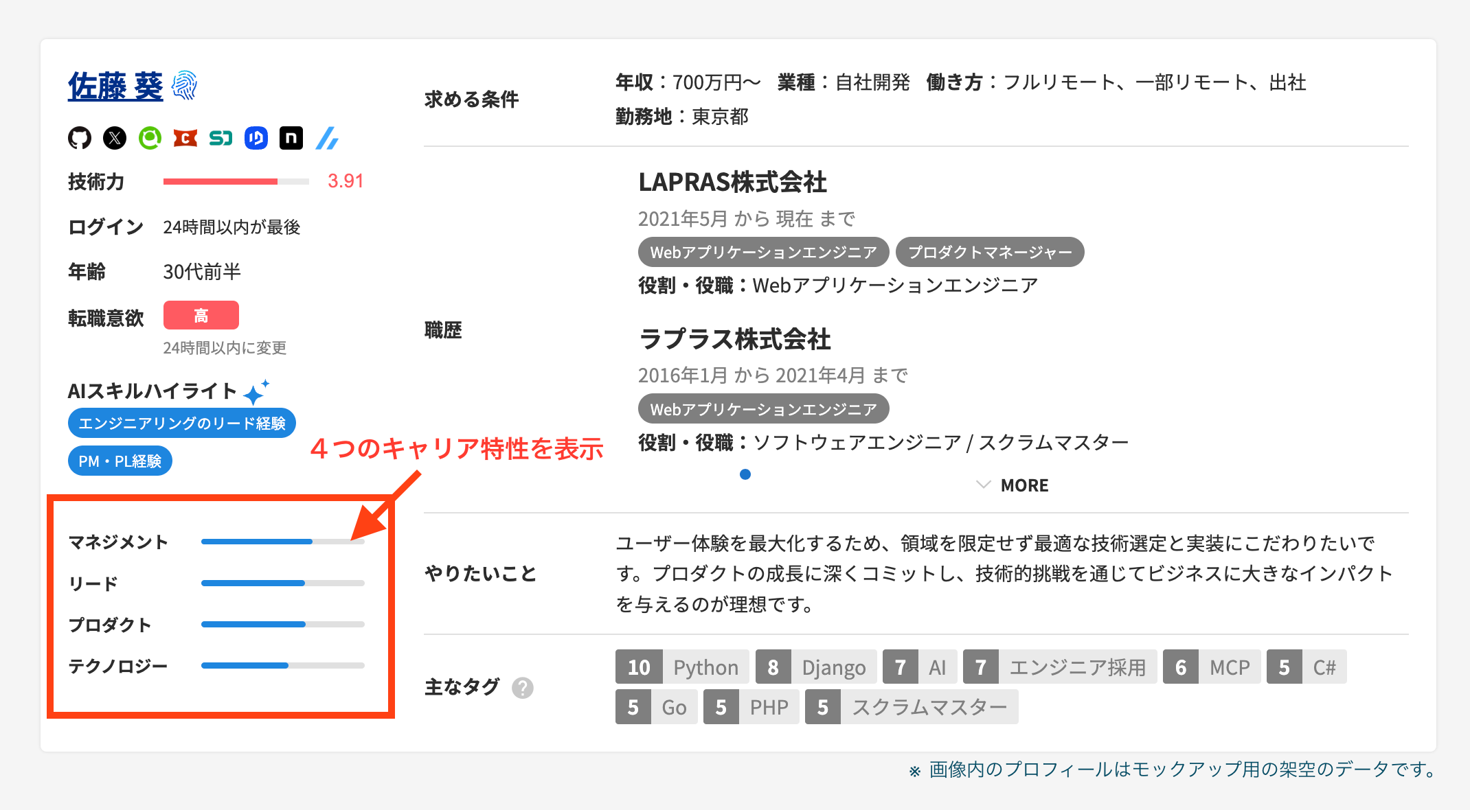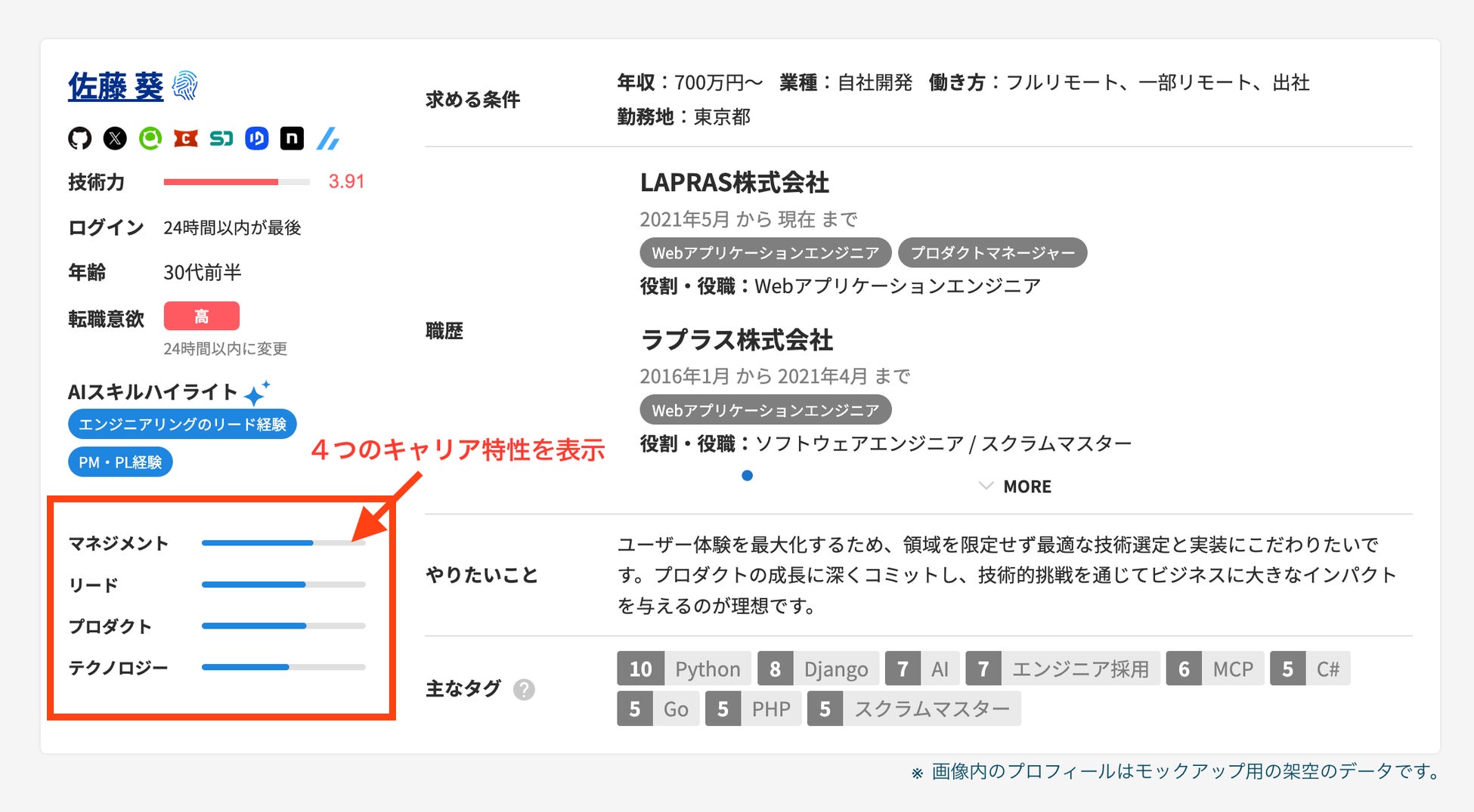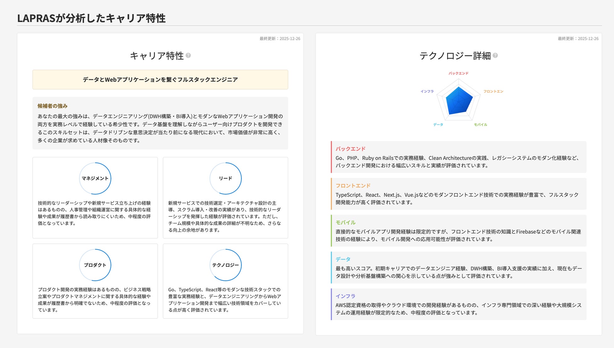 今回の機能公開により、これまでエンジニア向けに提供していたエンジニアの総合力を可視化する指標である「キャリア市場価値」を、企業の採用担当者にも最適化した形で表示できるようになりました。 LAPRASが保有する独自データをAIが多角的に解析し、まるで熟練の人材エージェントが候補者の強みを整理して推薦するようにサービス上で可視化します。