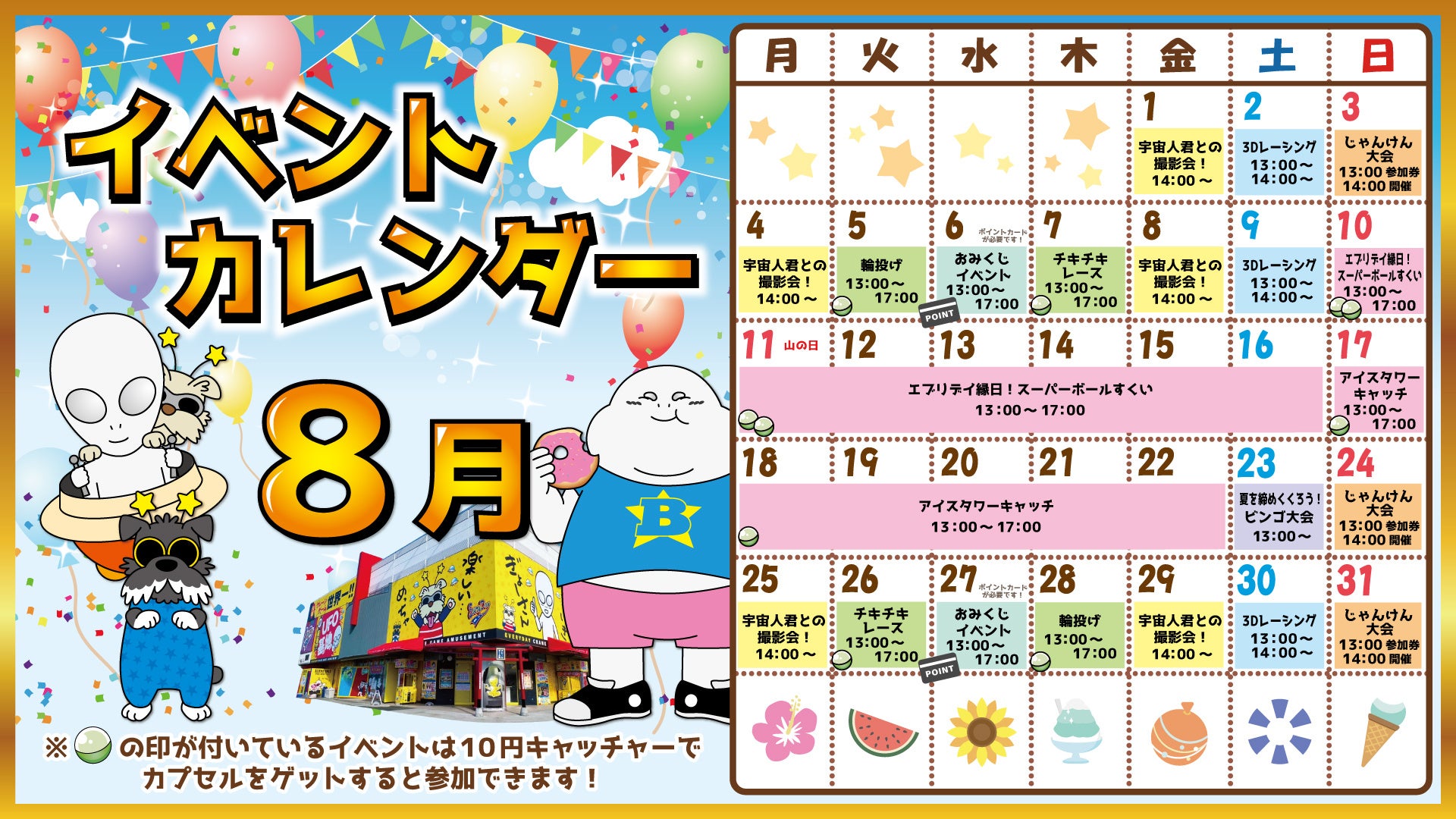 「笑顔創造」が企業理念の株式会社東洋(代表取締役:中村秀夫/本社:埼玉県桶川市以下、当社)は、運営するクレーンゲームのテーマパーク「エブリデイ」は、猛暑の屋外でも安心して楽しめるようにクレーンゲーム以外にも毎日開催の無料イベントと涼しい空間を提供いたします。