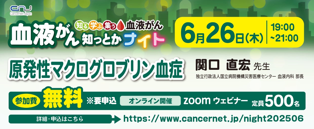 認定NPO法人キャンサーネットジャパン(東京都文京区 理事長 岩瀬 哲)は、血液がんに関するオンラインセミナー「血液がん知っとかナイト」を開催しており、第16回となる6月は「原発性マクログロブリン血症」をテーマに開催する運びとなりました。