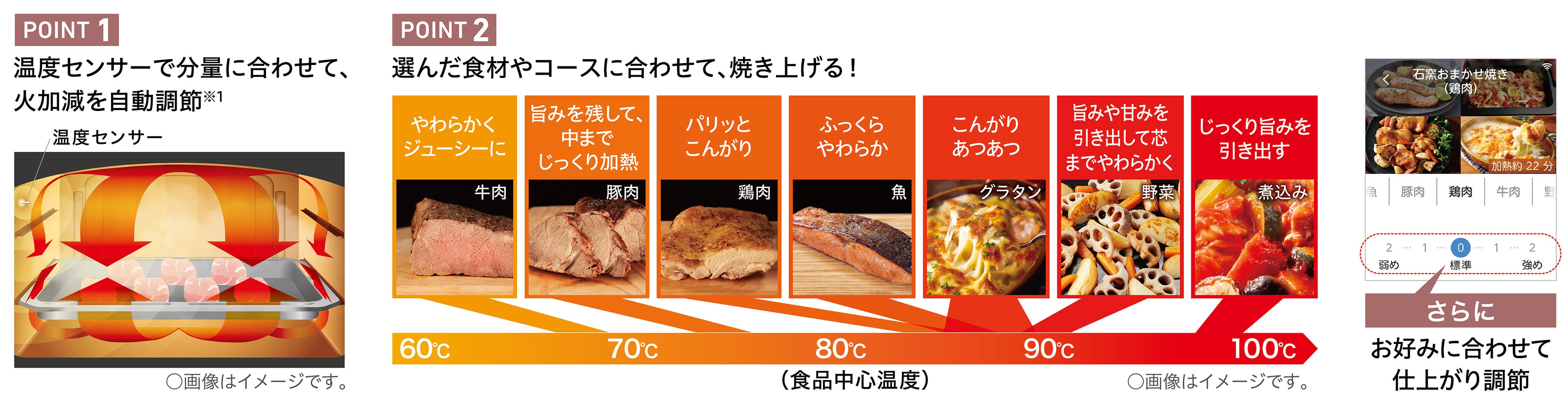 また、当社独自の分量検知技術を応用した「分量フリー自動メニュー」を新採用。ハンバーグや茶わん蒸しなど定番の7メニューを搭載しました。メニューを選ぶだけで分量に合わせて加熱を自動調節するので、バリエーション豊富な料理を簡単に楽しめます。