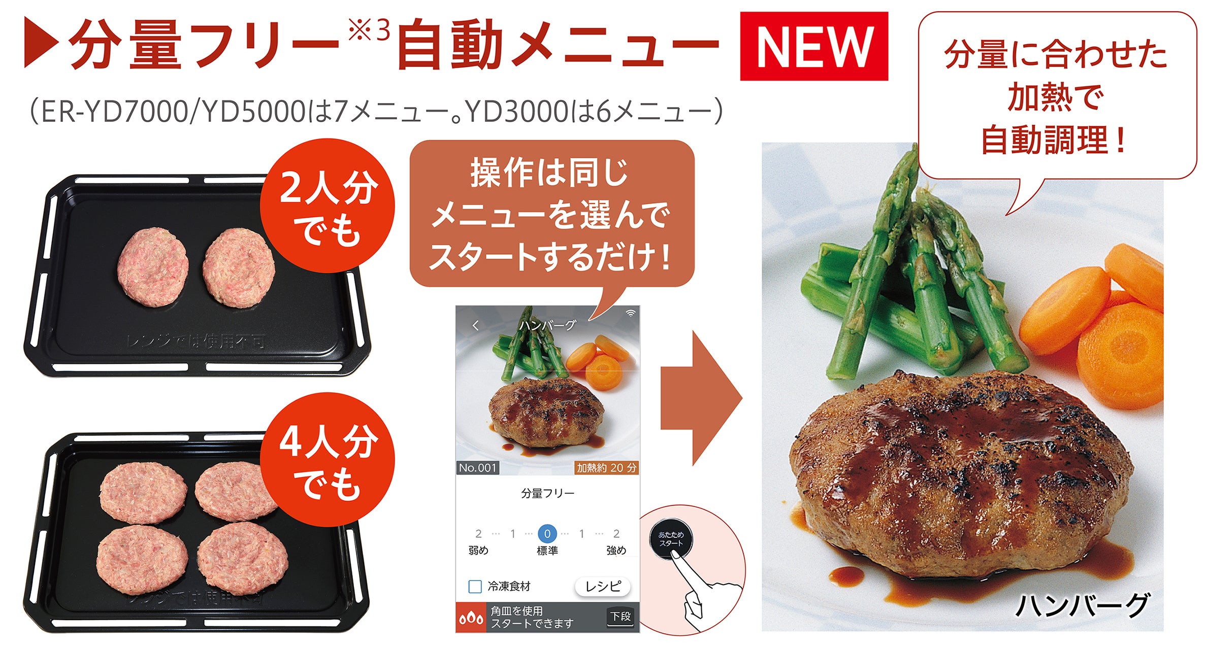 2. 分量に合わせて加熱を自動調節する「分量フリー自動メニュー」をハンバーグ・茶わん蒸しなど定番の7メニューに搭載