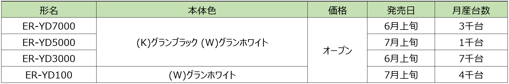 左から、ER-YD7000(K)グランブラック/ER-YD5000(K)グランブラック/ER-YD3000(W)グランホワイト/ER-YD100(W)グランホワイト