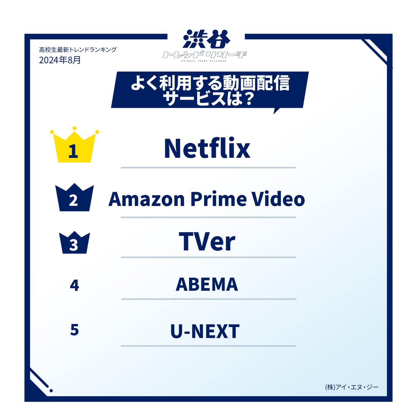 1位は「Netflix」が入選。「Netflix限定の映画とドラマが面白いから」(高3・女子)など、Netflixでしか視聴できないオリジナルドラマや恋愛リアリティーショーが人気のようです。また、「親子で入会しているから」(高2・男子)という声も多く寄せられました。2位に「Amazon Prime Video」がランクイン。映画やドラマの配信に加えて「アニメがたくさんあるから」(高3・女子)などのアニメの種類が豊富な点が魅力のようです。3位には、「TVer」が選ばれました。「見逃した番組が見られるから」(高3・女子)といったコメントも多数散見され、若年層のテレビ離れが叫ばれはじめて久しいが、話題のドラマや人気のバラエティ番組はTVerの1週間以内の見逃し配信できちんと視聴している高校生が多い様子がうかがえます。