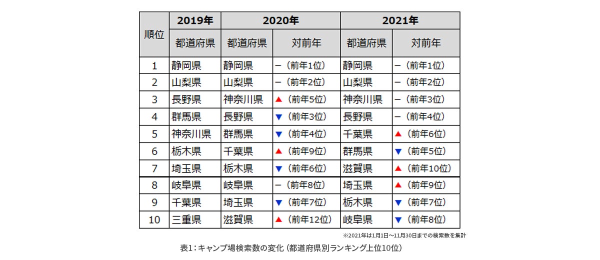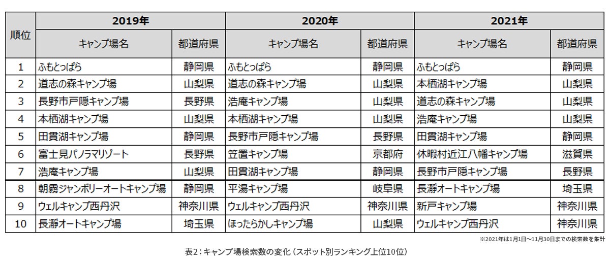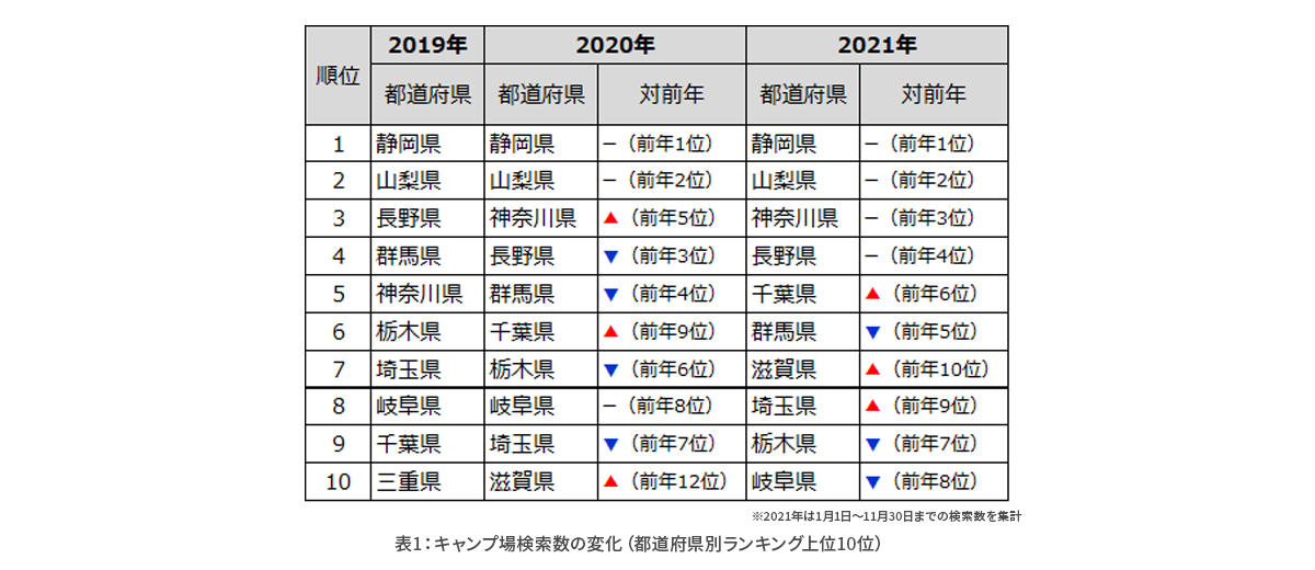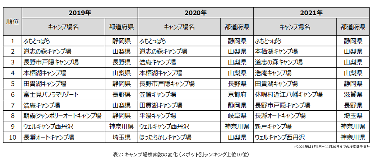 都道府県別(表1)に見ると、いずれの年も静岡県や山梨県、神奈川県など主に首都圏からアクセスしやすい都道府県のキャンプ場が多いことがわかります。また、2019年ランキング圏外だった滋賀県は、2020年10位、2021年7位と上昇傾向です。