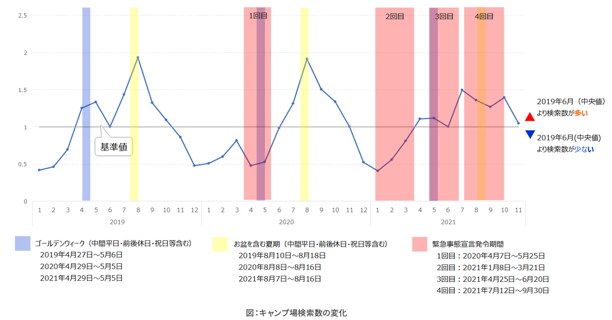 そこで、2019年1月~2021年11月までの期間を対象に、緊急事態宣言発令期間やその前後、ゴールデンウィーク等におけるキャンプ場検索の変化を分析いたします。なお本分析には、全国の自動車利用を対象に、ナビタイムジャパンが提供する各種ナビゲーションサービス(『NAVITIME』、『カーナビタイム』等)から同意を得て取得した経路検索条件データ(検索履歴データ)を用いています。