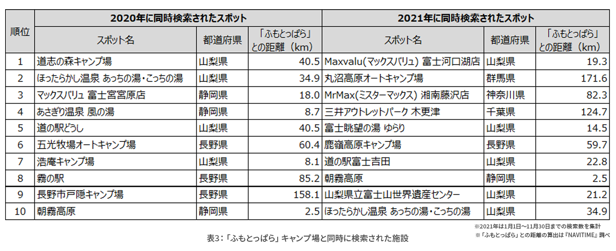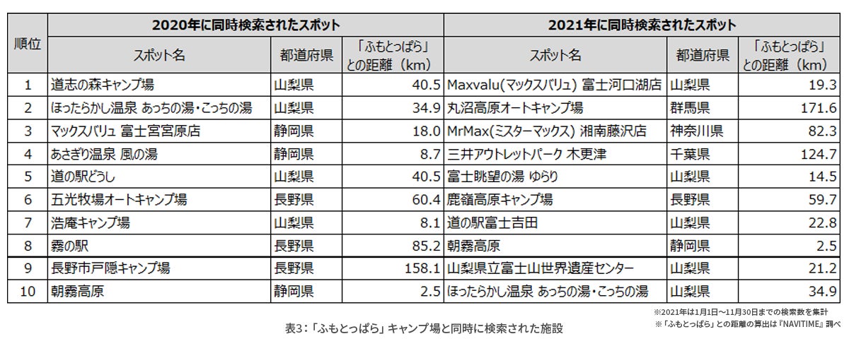 表3を見ると、2020年及び2021年ともに静岡県や山梨県、長野県など周辺地域の他キャンプ場や温泉、道の駅が上位にランクインしています。また、2021年はスーパーやショッピングセンターなどキャンプ用品や食材を購入できるようなスポットや、自動車での移動中に立ち寄りやすいアウトレットなども同時に検索されていることがわかります。