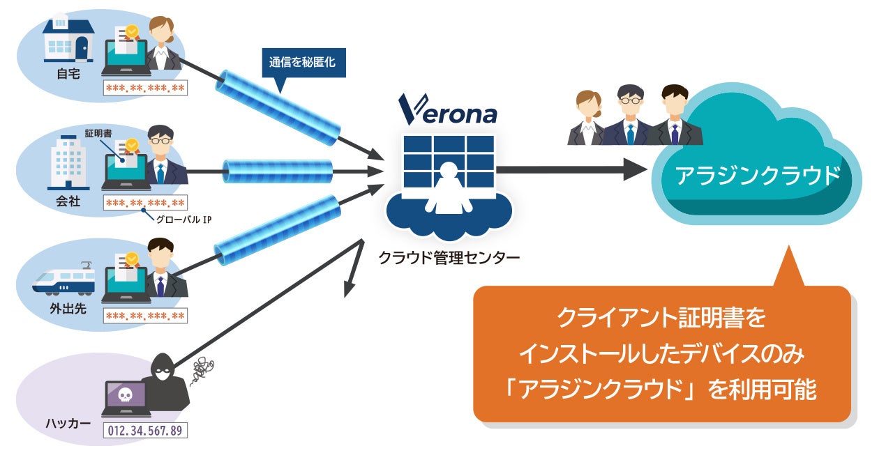 下記の「Verona」の機能によりセキュリティが向上し、「アラジンクラウド」ご利用企業様はより安全にシステムをご利用いただくことができます。