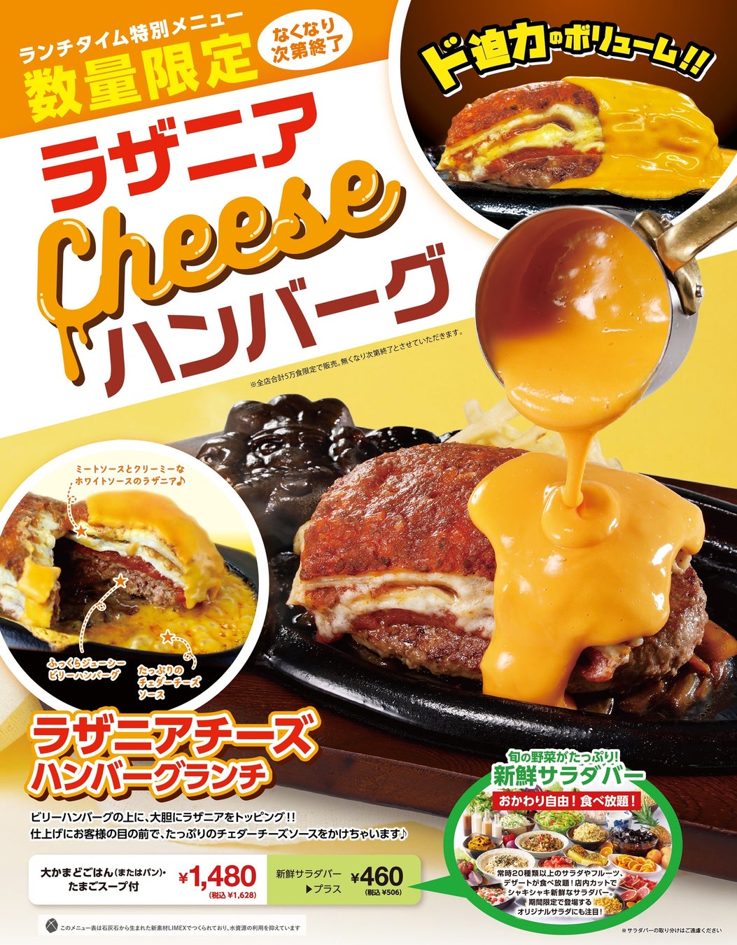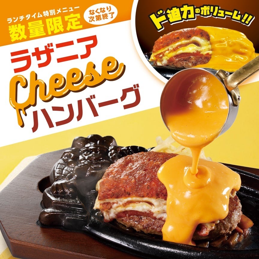 ≪5万食限定≫ふっくらジューシーなハンバーグとアツアツなラザニアのW主演!濃厚なチェダーチーズソースが鉄板に踊る『ラザニアチーズハンバーグランチ』を5月17日(金)より数量限定で提供開始