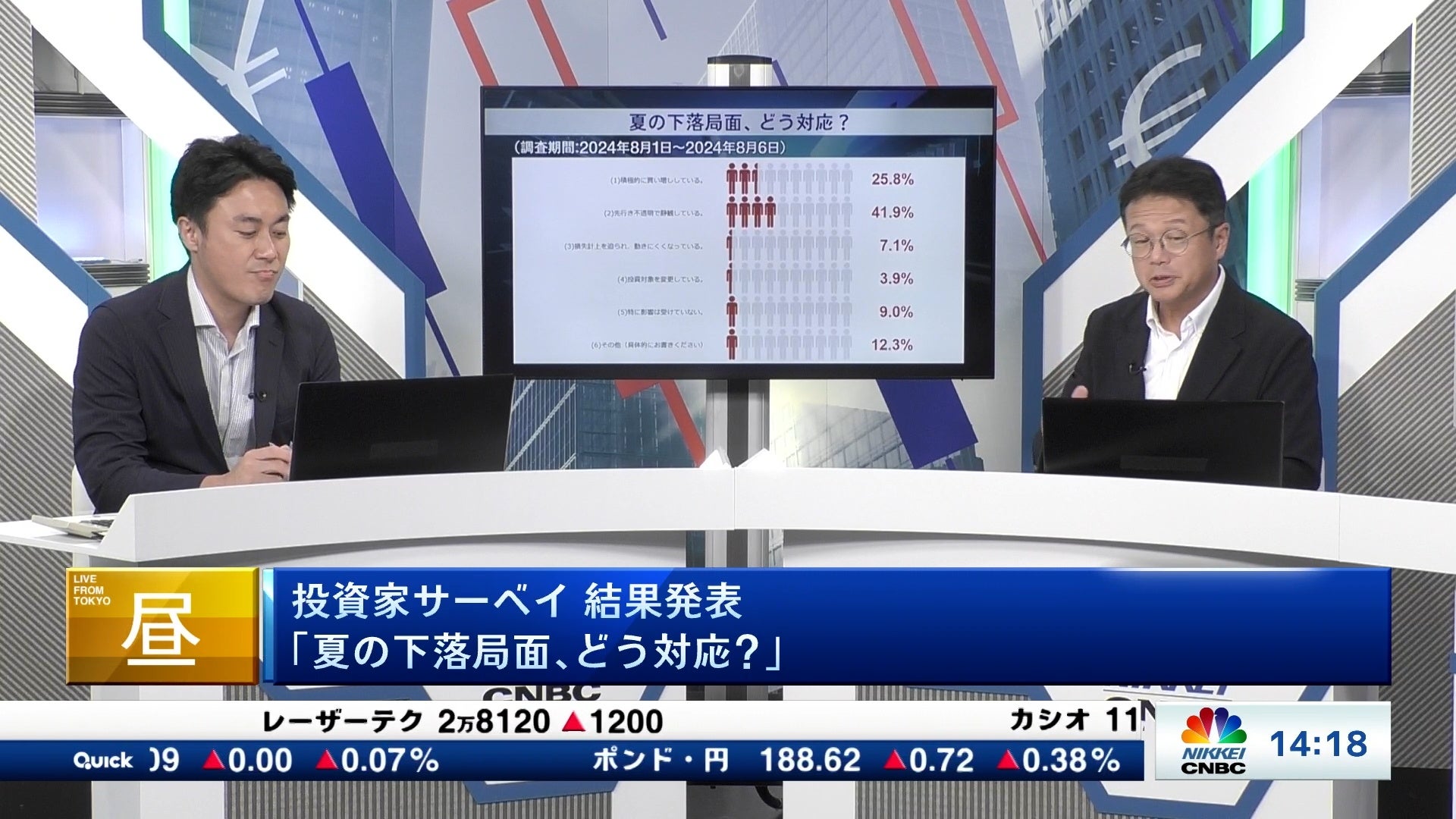 調査期間中の8月5日(月)には日経平均株価の下落幅が過去最大となるなど、足元の相場は荒い値動きとなっています。8月13日(火)に放送した『昼エクスプレス』では、日経CNBCの直居敦と岡村友哉が調査結果やその背景について語りました。