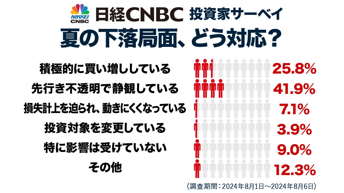 【⽇経CNBC・投資家アンケート】史上空前の下落局面にどう対応?「先行き不透明で静観」が41.9%と最多、「積極的に買い増し」は25.8%