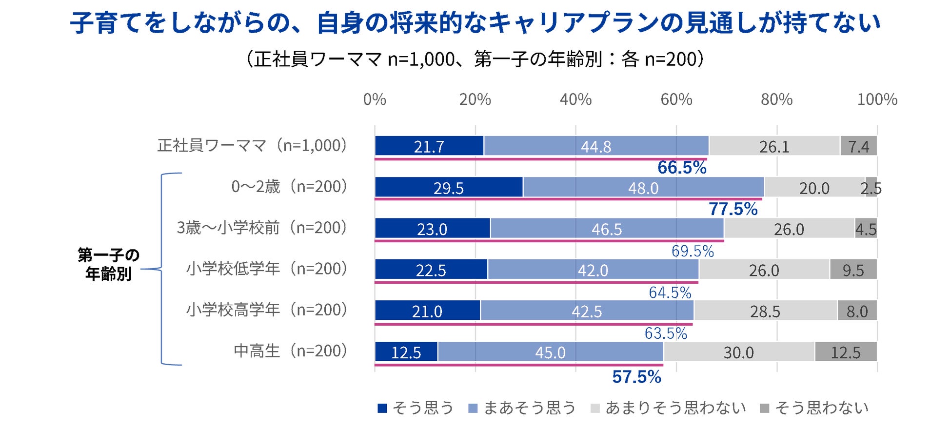 3人に2人(66.5%)が「将来的なキャリアプランの見通しが持てない」と感じている。第一子が2歳以下の場合が最も高く77.5%にのぼる。第一子の年齢が低いほど見通しが持てない割合が高いことが明らかに。