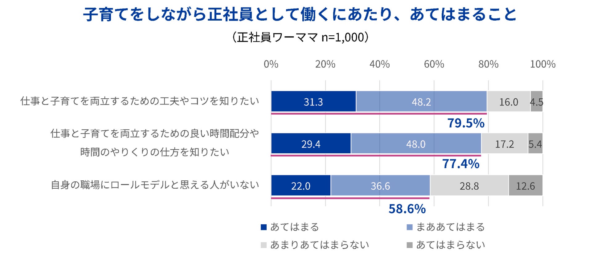 正社員ワーママの79.5%が、仕事と子育てを両立するための「工夫やコツが知りたい」、77.4%が「良い時間配分や時間のやりくりの仕方を知りたい」と感じていることが分かりました。また、58.6%は「職場にロールモデルと思える人がいない」と感じていました。仕事と家事・育児に追われる中で、職場で参考になるような先輩ワーママがあまりおらず、うまく両立するための工夫や、より良い時間の使い方を知りたいと感じる正社員ワーママが多い状況が伺えます。