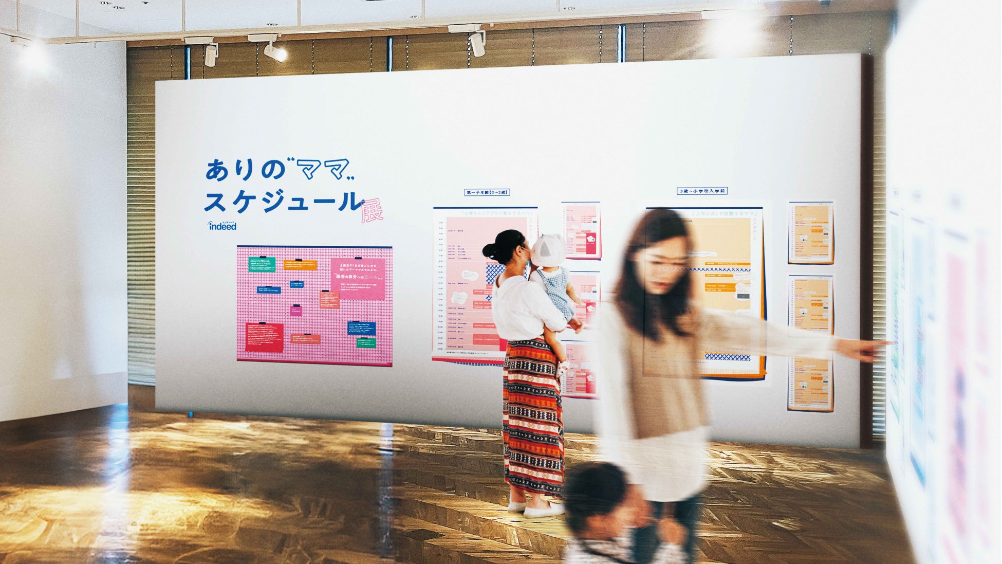 Indeedは、多忙な中で仕事と子育ての両立を目指す女性をサポートしたいと考え、「ありの”ママ” スケジュール展」を開催いたします。本展示会では、複数の現役正社員ワーママから寄せられたリアルな1日(24時間)のスケジュールを、仕事と子育ての両立の工夫やコツとともに展示します。また、ワーママの皆さんが過去の自分に送るエールも併せて掲出します。訪れた方も自由に、自分が実践している両立の工夫やヒント、自分自身や周囲のワーママへのエールを書き込めるスペースもあります。是非お立ち寄りください。