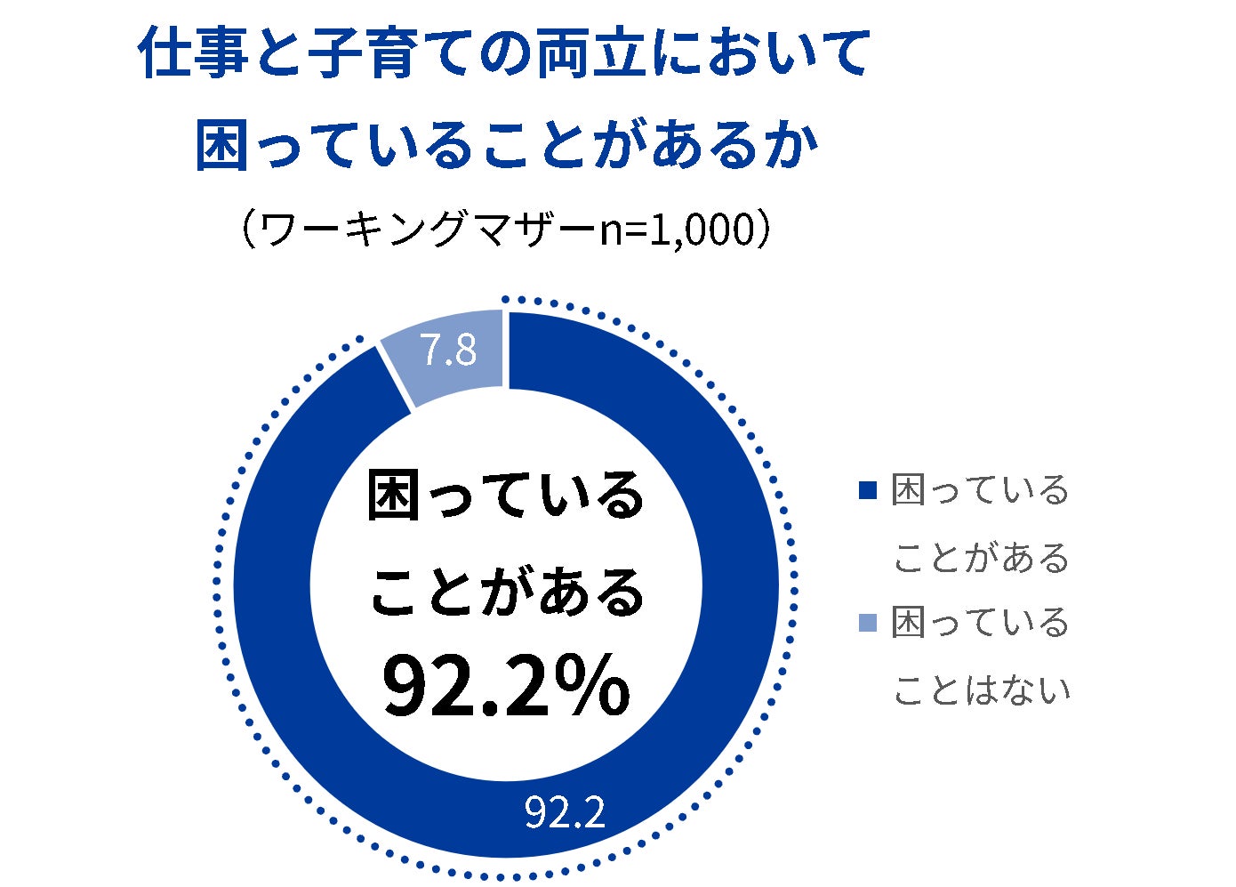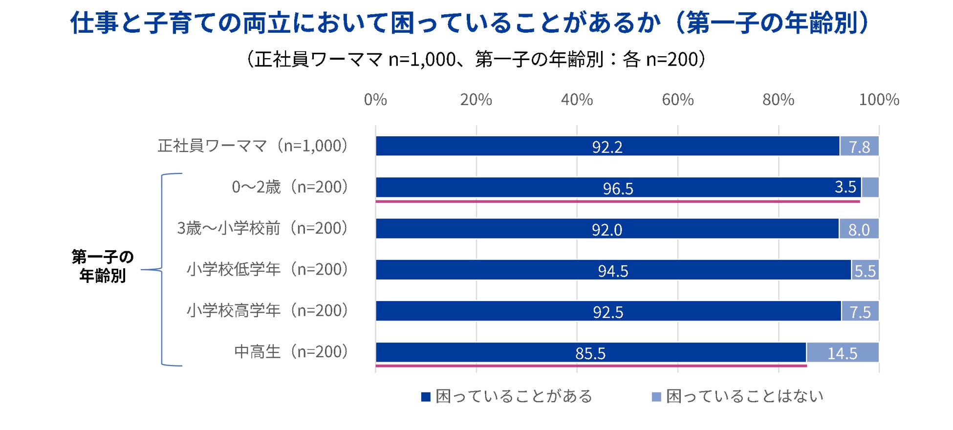 1. 正社員ワーママの92.2%が「仕事と子育ての両立に何かしらの困難」を抱えている。子どもの年齢別では、第一子の年齢が0~2歳時で最も高く(96.5%)、第一子が中高生で最も低い(85.5%)