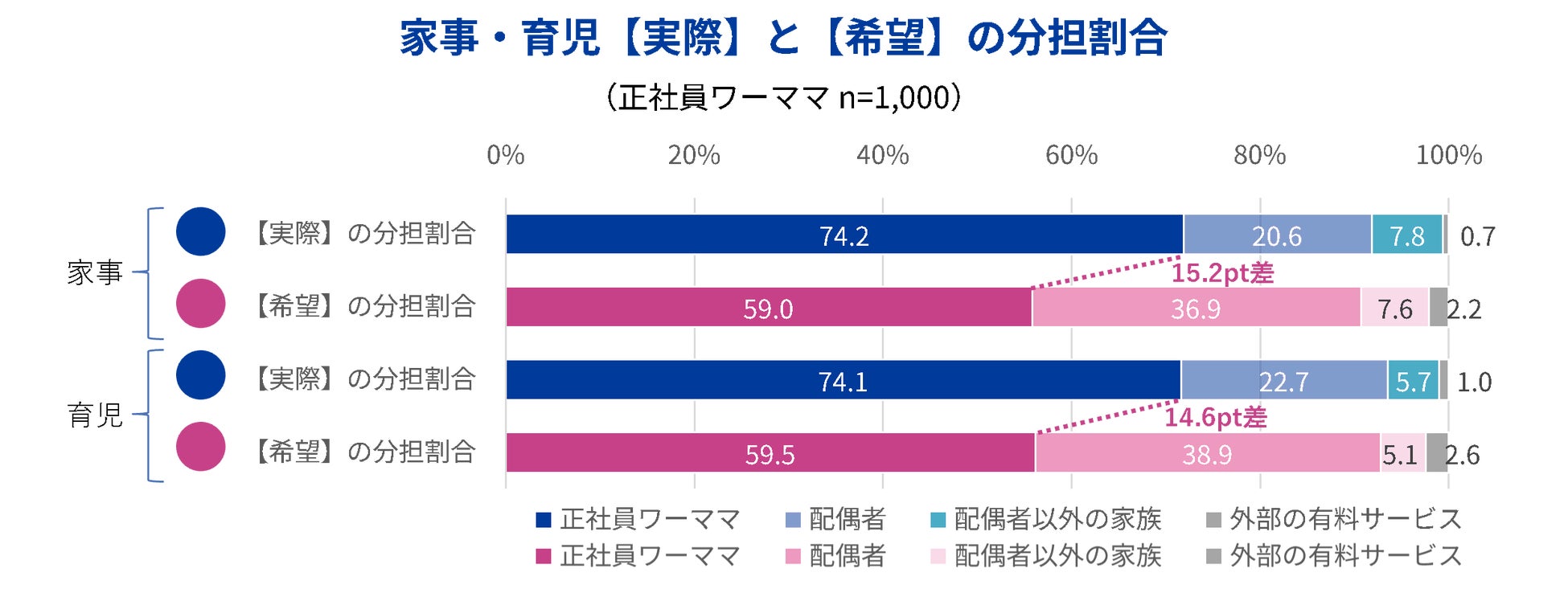 正社員ワーママに、家事と育児それぞれについて、「ご自身」「配偶者」「配偶者以外の家族」「外部の有料サービス」での希望する分担割合と実際の分担割合を伺いました。その結果、家事の希望分担割合は平均で「ワーママ本人」が59.0%、「配偶者」が36.9%、「配偶者以外の家族」が7.6%、「外部の有料サービス」が2.2%でした。育児の希望分担割合も同傾向で、平均で「ワーママ本人」が59.5%、「配偶者」が38.9%、「配偶者以外の家族」が5.1%、「外部の有料サービス」が2.6%でした。
