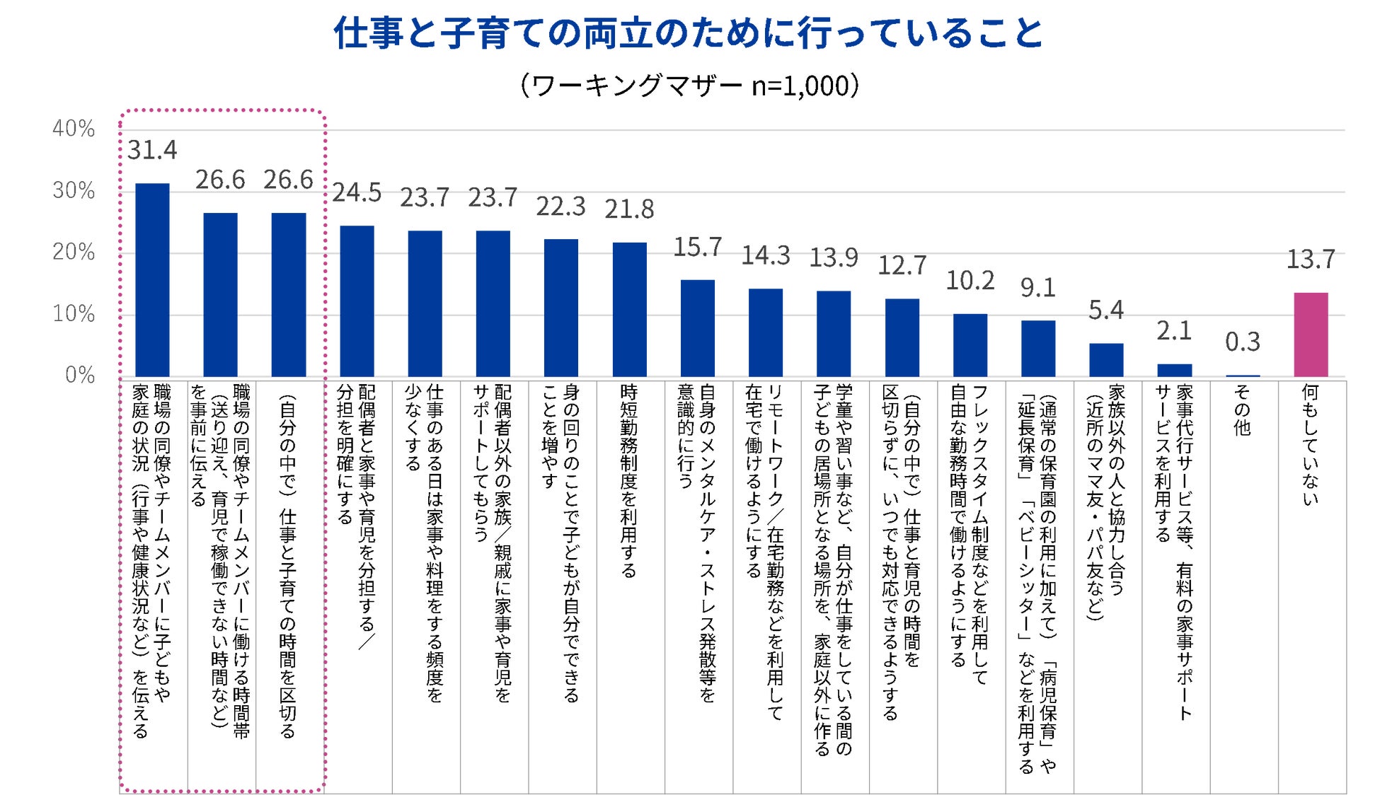 正社員ワーママに「仕事と子育ての両立のために行っていること」を尋ねたところ、最も多かったのは「職場の同僚やチームメンバーに、子どもや家庭の状況(行事や健康状況など)を伝える」(31.4%)、次いで「職場の同僚やチームメンバーに、働ける時間帯(送り迎え、育児で稼働できない時間など)を事前に伝える」(26.6%)および「(自分の中で)仕事と子育ての時間を区切る」(26.6%)でした。子どもや家庭、自身の稼働可能な時間帯などを職場に共有し、理解や協力を得ることに努めている方が多いことが分かりました。
