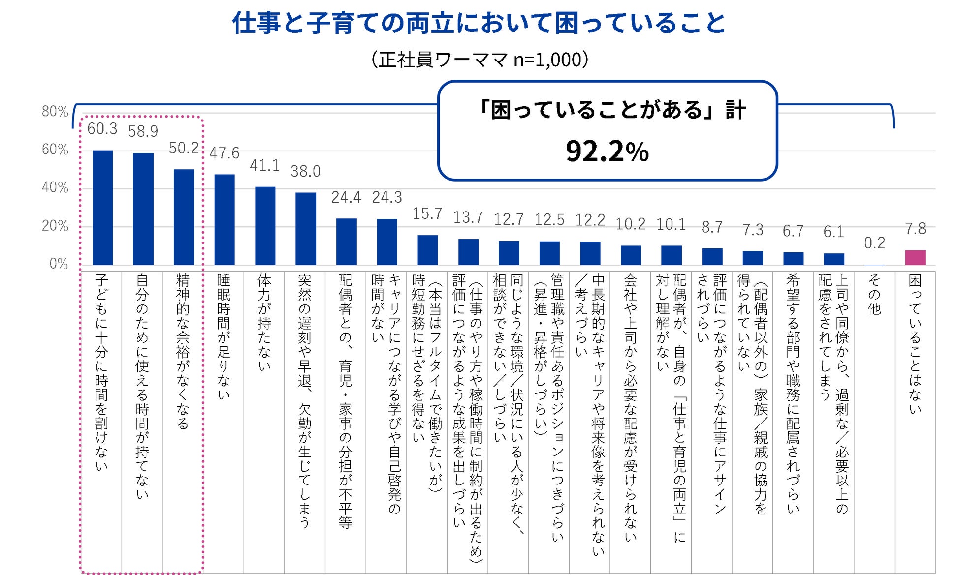 正社員ワーママに「仕事と子育ての両立において困っていること」を聞くと、困っていることはないと回答した人は7.8%で、92.2%が何らかの困りごとを抱えていることがわかりました。具体的な困り事として最も多かったのは「子どもに十分に時間を割けない」(60.3%)、次いで「自分のために使える時間が持てない」(58.9%)、「精神的な余裕がなくなる」(50.2%)で、この3つは半数以上が該当する結果です。多くの正社員ワーママが、子どものための時間も、自分のための時間や精神的な余裕も持てず、悩んでいる様子がうかがえます。