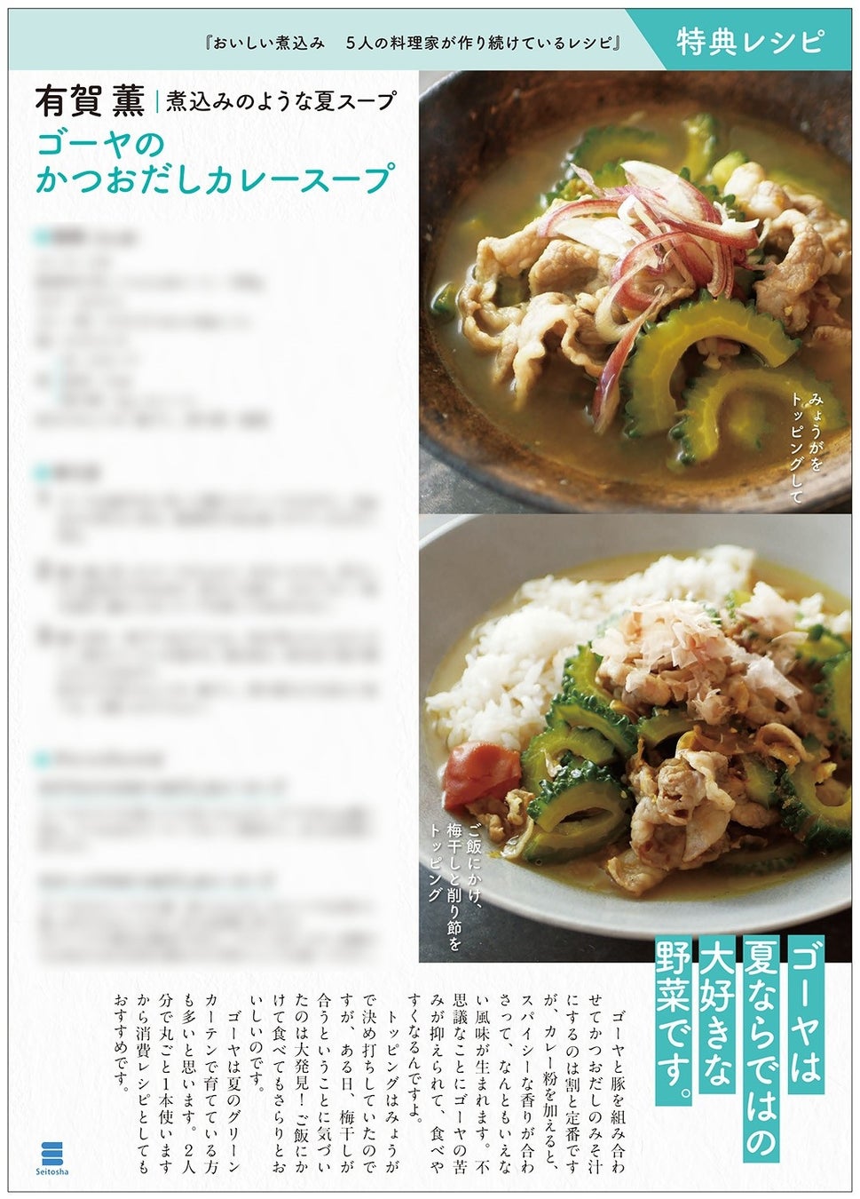 当社では夏にこそ煮込みを食べて欲しいという思いをこめて、「夏こそ煮込み!」フェアを開催。6月20日頃から、有賀 薫さんの“煮込みのような夏スープ”レシピを特典として全国の一部書店様にて配布いたします。