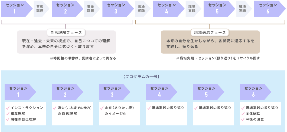 本商品は、共通の定型コンテンツを敢えて置かず、受講者の日常をテーマに6カ月間の継続支援をいたします。6カ月の間に、新たな取り組みの後押しと、その振り返りのサイクルを回すことで、受講者の変容の可能性を高められます。