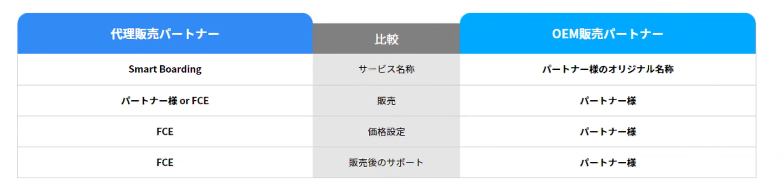販売代理店は、当社が提供している『Smart Boarding』をご紹介いただくものとなりますが、OEMパートナーは『Smart Boarding』をOEMパートナー企業のオリジナル商品としてロゴやデザイン、サービス内容を作り変えて販売いただくものとなります。販売方法や価格、サポート方法などもパートナー企業が独自に設定することが可能となり、パートナー企業のご本業との相乗効果を生み出しながら、新たな収益を得ていただけるモデルとなっています。