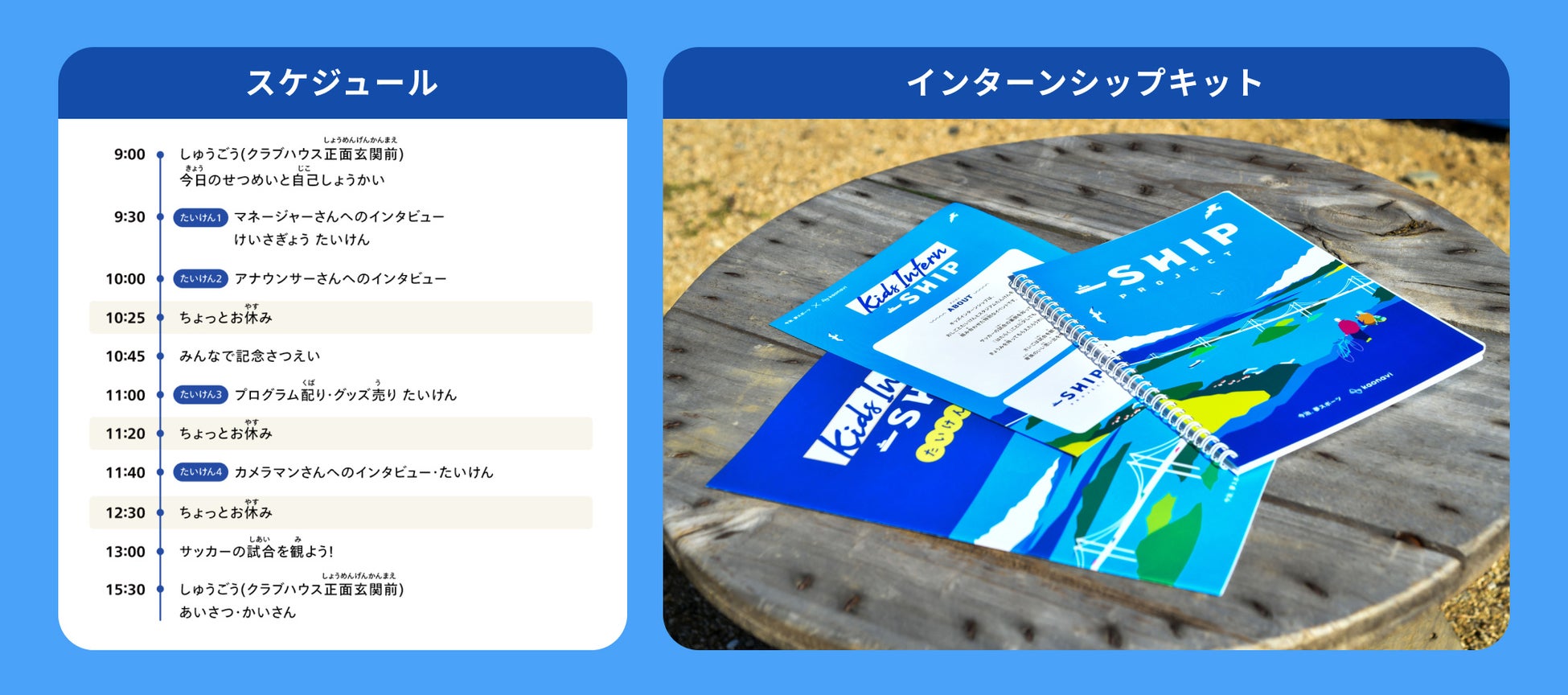 今回の第二弾では、今治. 夢スポーツとカオナビ社員のお子様を対象に「キッズインターンシップ」を実施しました。普段見慣れたサッカーの試合の裏側に触れることで、“はたらく”について興味を持ってもらうことを目的としています。