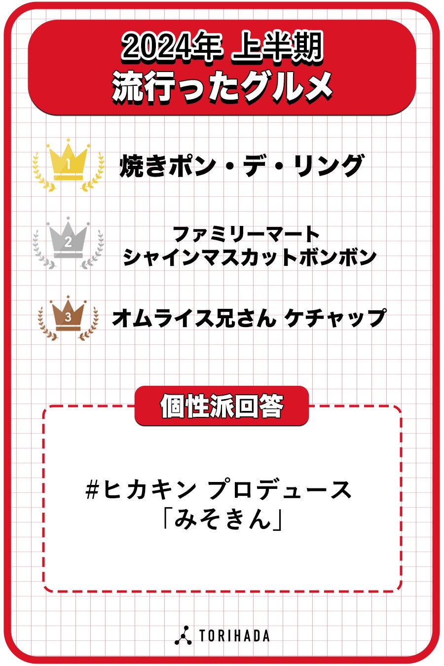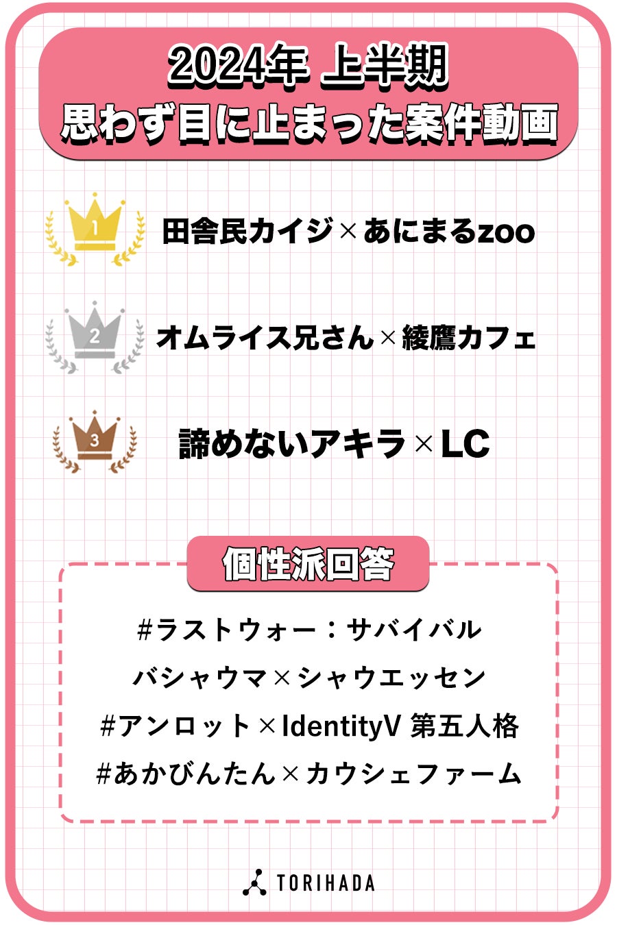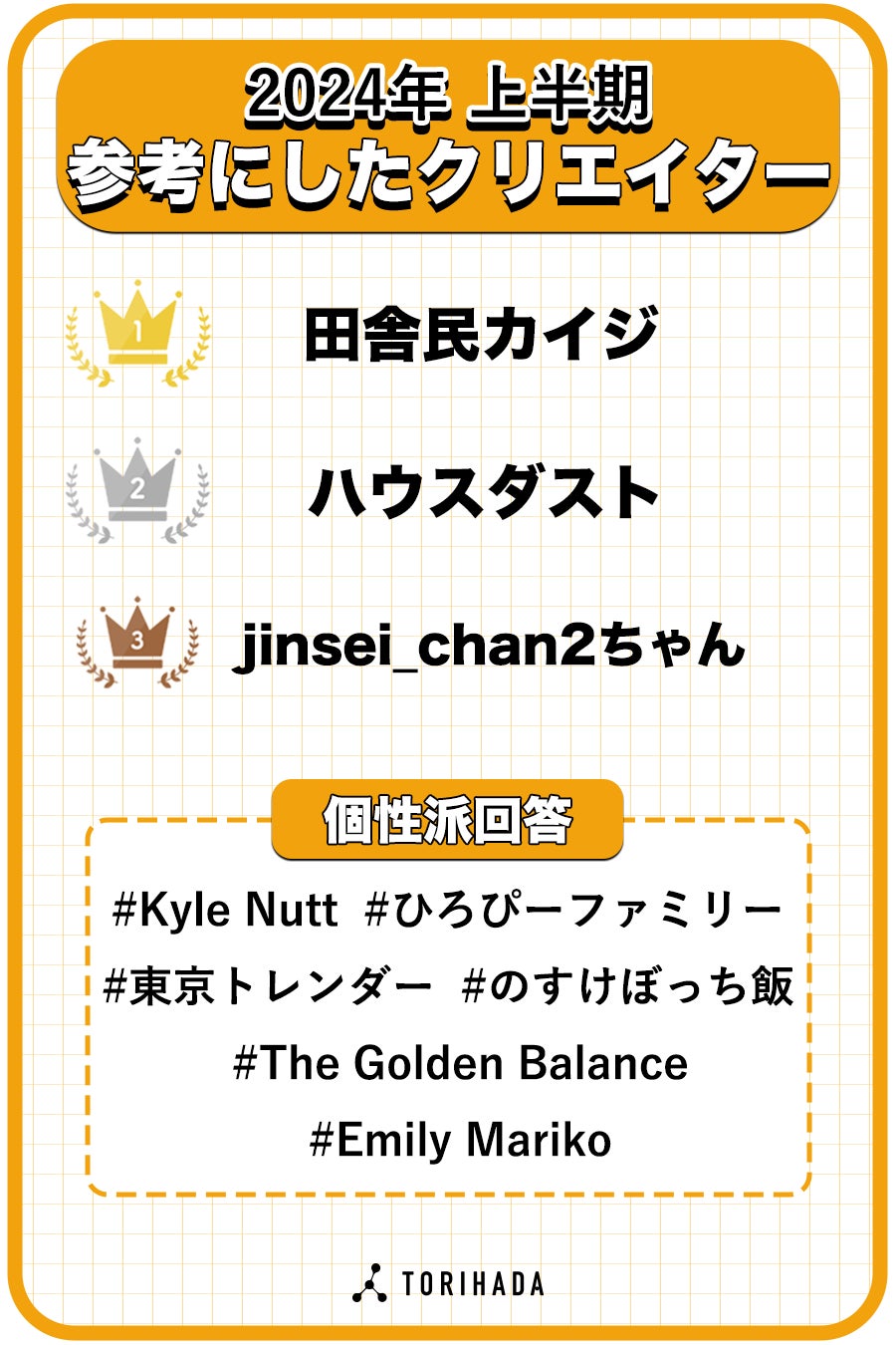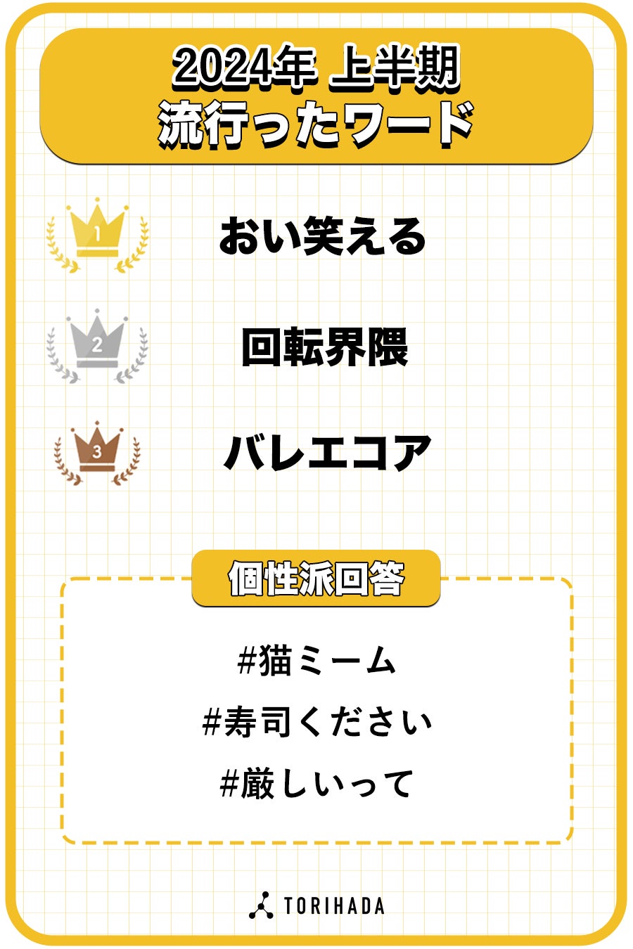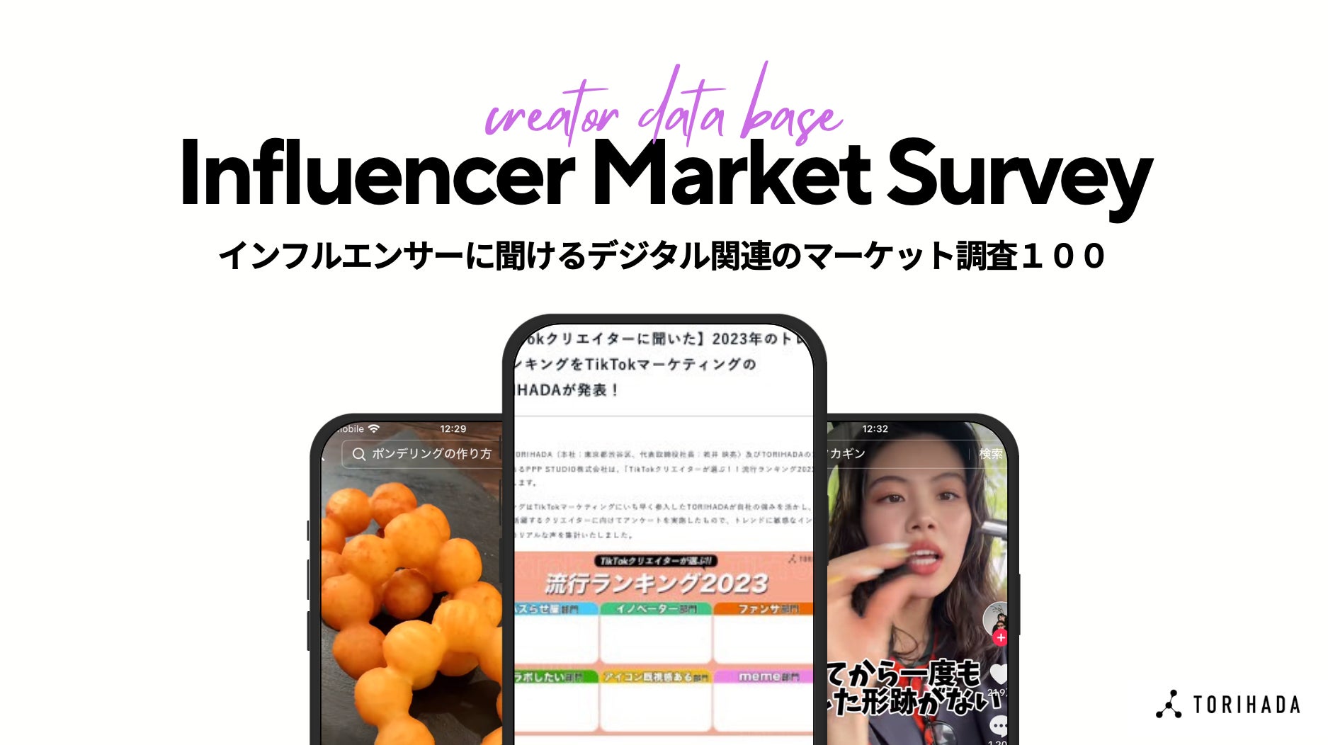 「TikTokクリエイターが選ぶ!流行ランキング2024上半期」は、TikTokを中心に活躍している動画クリエイター約1,000人に向けて2024年6月にアンケート調査を実施。クリエイター目線から2024年にTikTokで流行ったもの・ことについてアンケート回答を集計しました。TORIHADAは、ショートムービーを活用したマーケティングにより企業のニーズに対応し、同時にクリエイターのマネジメントを行うことで個人経済の構築を目指す企業です。今回のアンケートではクリエイター事務所「PPP STUDIO」に所属または提携のあるクリエイターを対象に調査を行うことでオリジナルのアンケート結果となっています。
