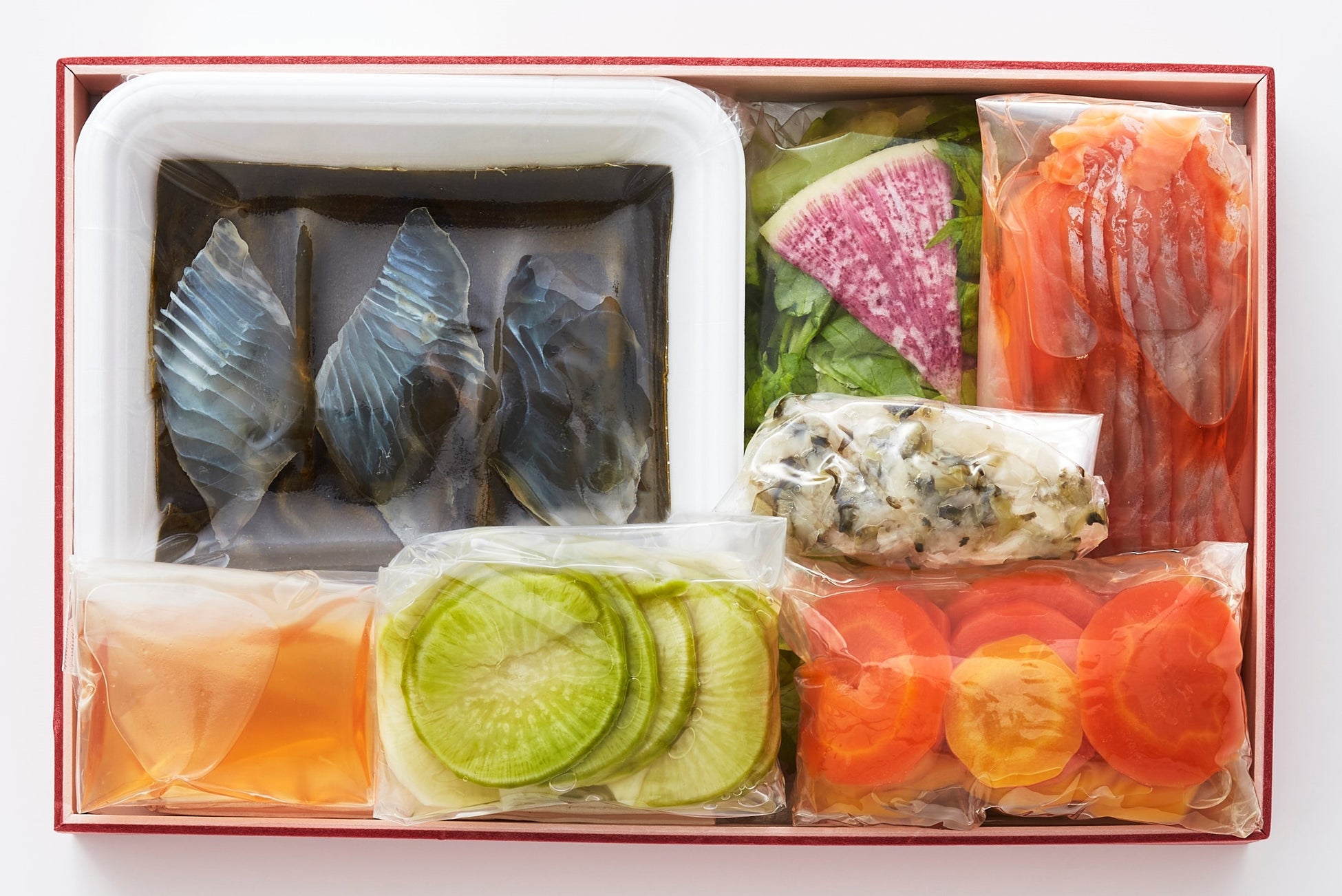 昆布〆ひらめ、スモークサーモントラウトの甘酢漬け、青心大根の甘酢漬け、金時人参と黄人参の煮しめ、生野菜、刻みすぐき漬け、煎り酒使用 まろやかドレッシング