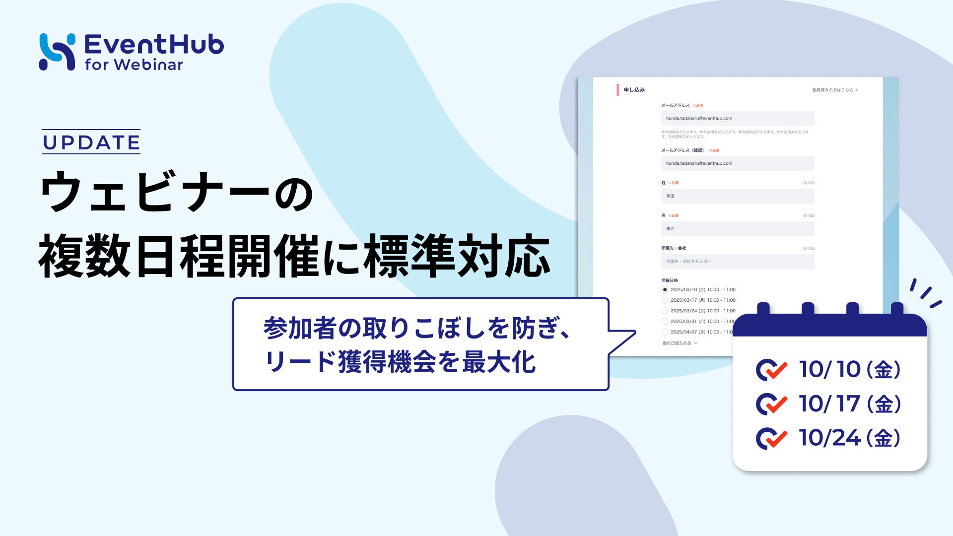 株式会社EventHub (東京都港区、代表取締役CEO:山本 理恵) が提供するシェアNo.1(※)イベント・ウェビナーマーケティングプラットフォーム「EventHub(イベントハブ)」は、ウェビナーの複数日程開催を手軽に実現するための機能アップデートを実施いたしました。