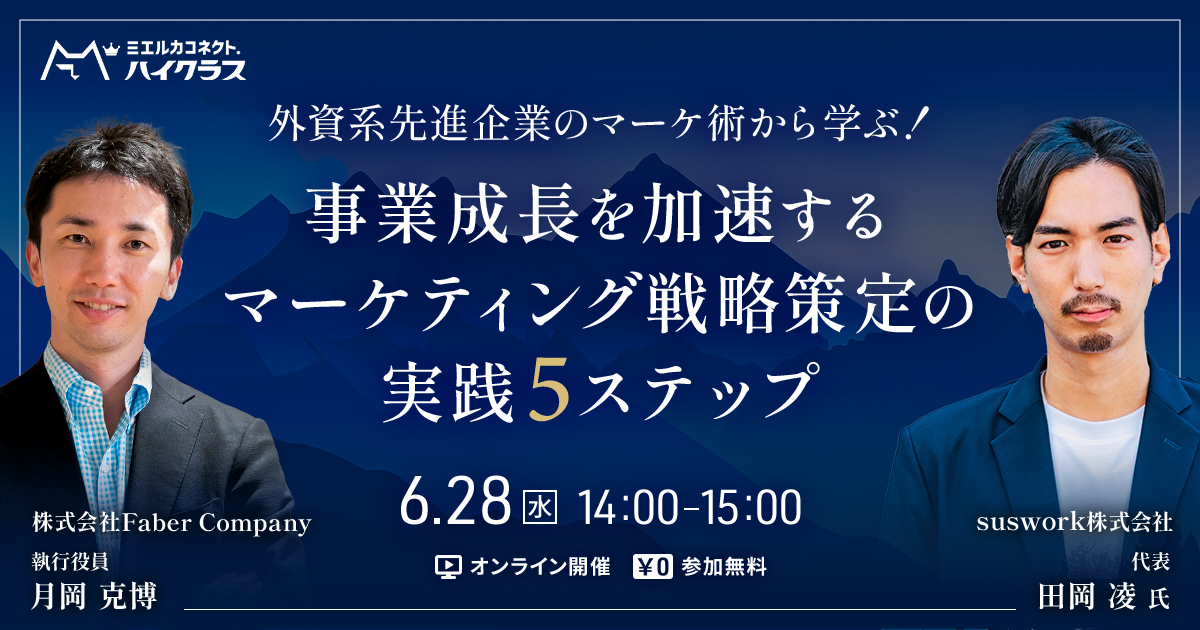 「すぐ実践できるマーケティング戦略策定の方法」をテーマに、suswork株式会社 代表 田岡 凌 氏と当社執行役員 月岡によるセミナーを実施いたします。マーケティング戦略と施策を推進する役員・事業部長の方、マーケティング戦略をどうつくればいいかわからないとお悩みの方は、ぜひご参加ください。
