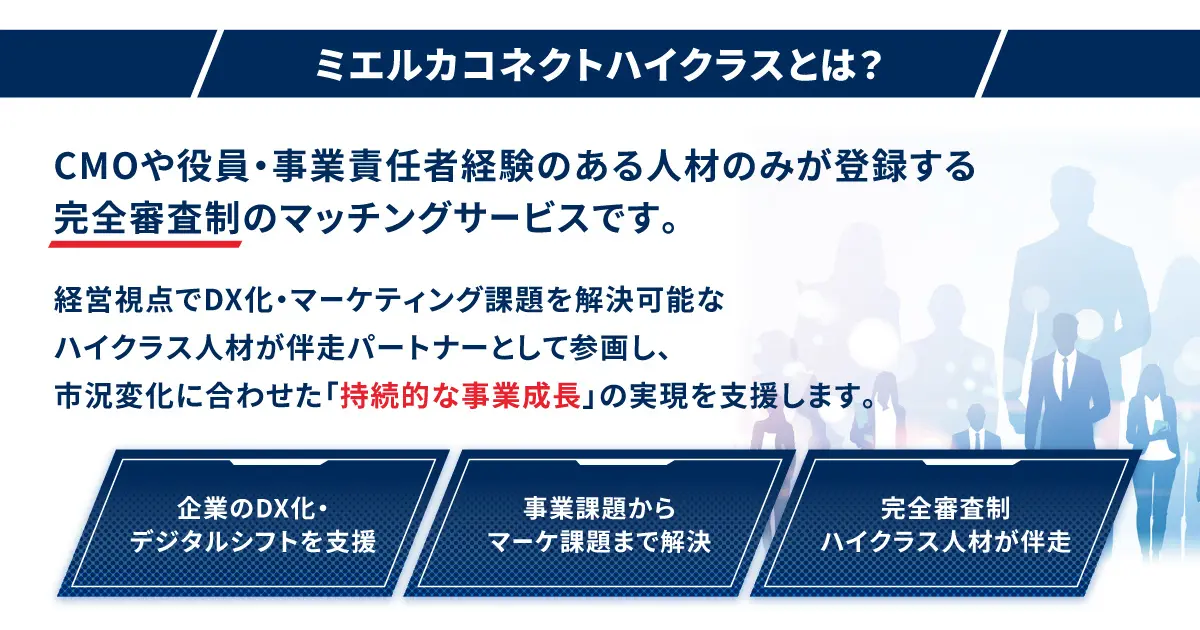 ミエルカコネクト ハイクラスは、経営視点でマーケティング課題を解決できる人材のみを集めたハイクラスマーケター専門の業務委託マッチングサービスです。紹介するマーケターの多くは、CMOや役員としての経験があり、事業成長に貢献するマーケティング戦略立案からその実行までを一気通貫で伴走支援することが可能です。