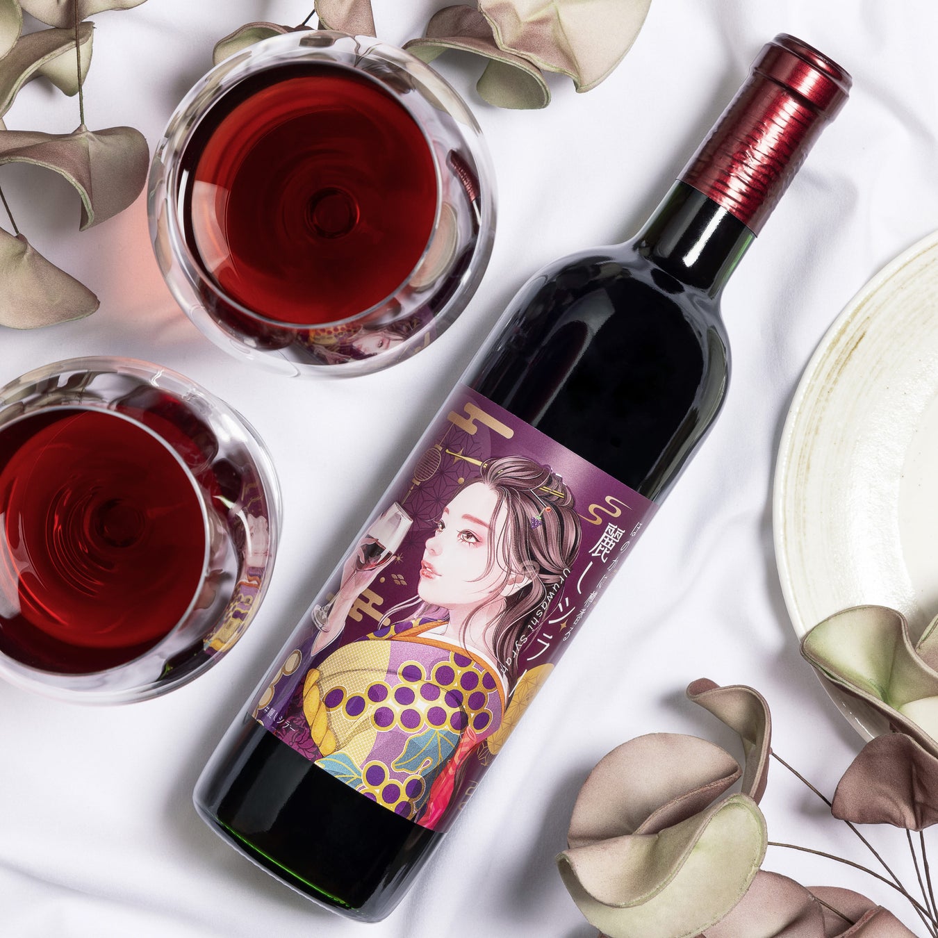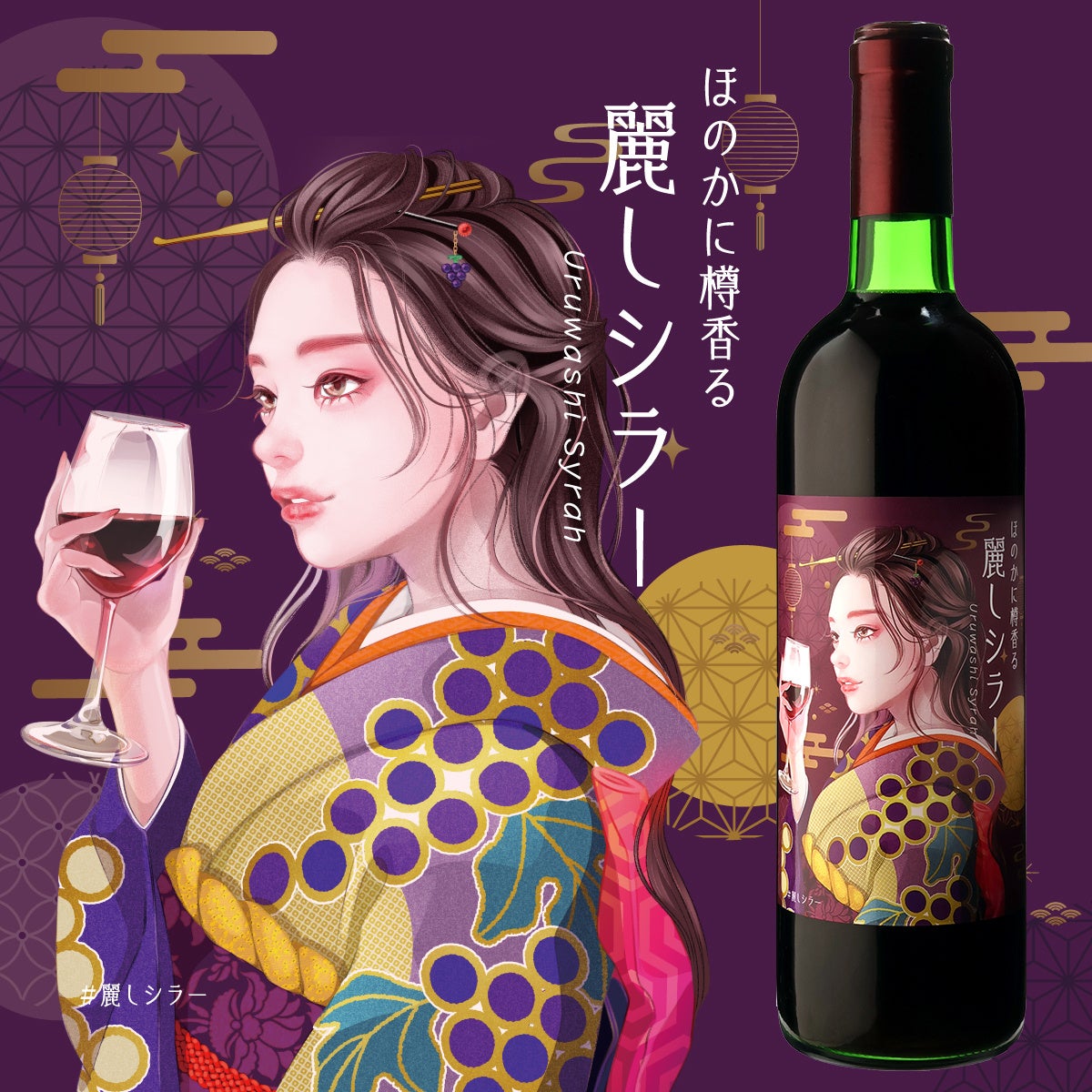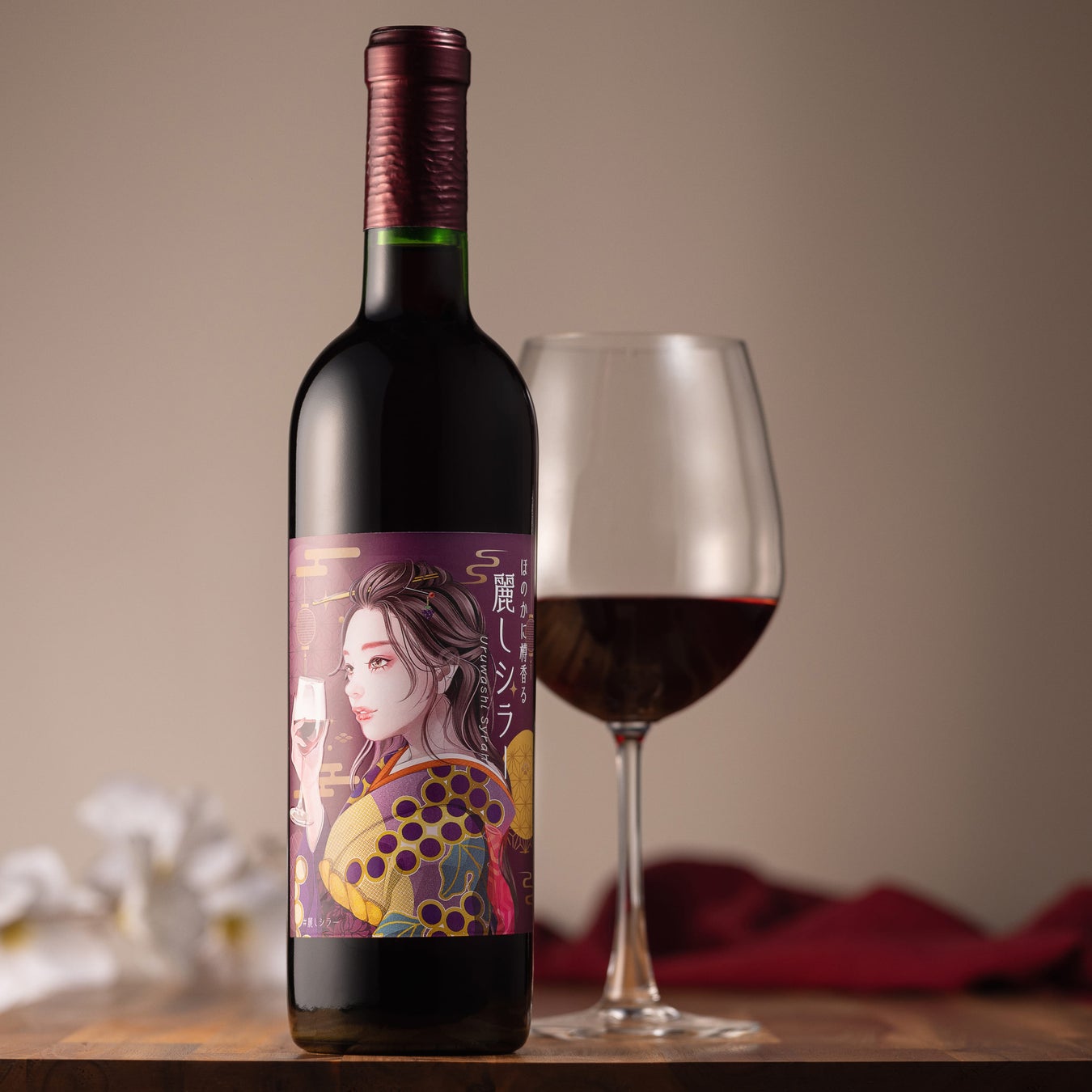 味わいはもちろん、その美しいデザインにもこだわりを込めた一本です。ボトルを彩るラベルには、ぶどう柄の着物をまとった麗しい女性が描かれ、特別な印刷技術によって立体感と繊細さが際立ちます。グラスを傾けるひとときをより一層贅沢にするこのデザインは、ギフトや記念日の一本としても最適です。