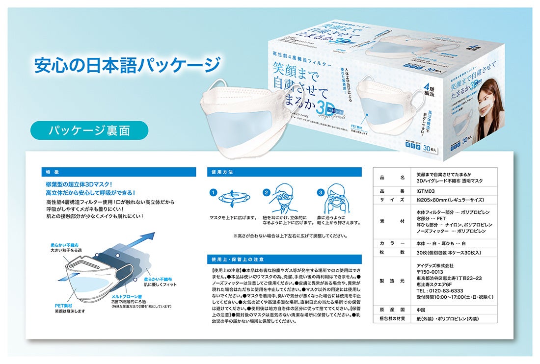 完全特注のオリジナルグッズの企画生産、およびウイルス対策グッズメーカー事業を手がけるアイグッズ株式会社(本社:東京都渋谷区)が、柳葉型で口元が透明なくちばし型マスク「笑顔まで自粛させてたまるか 3Dハイグレード不織布マスク」を発売。マスク着用によって笑顔・表情が伝わりにくいとお困りの企業様に、ぜひおすすめしたい「笑顔を自粛しない」透明マスクです。